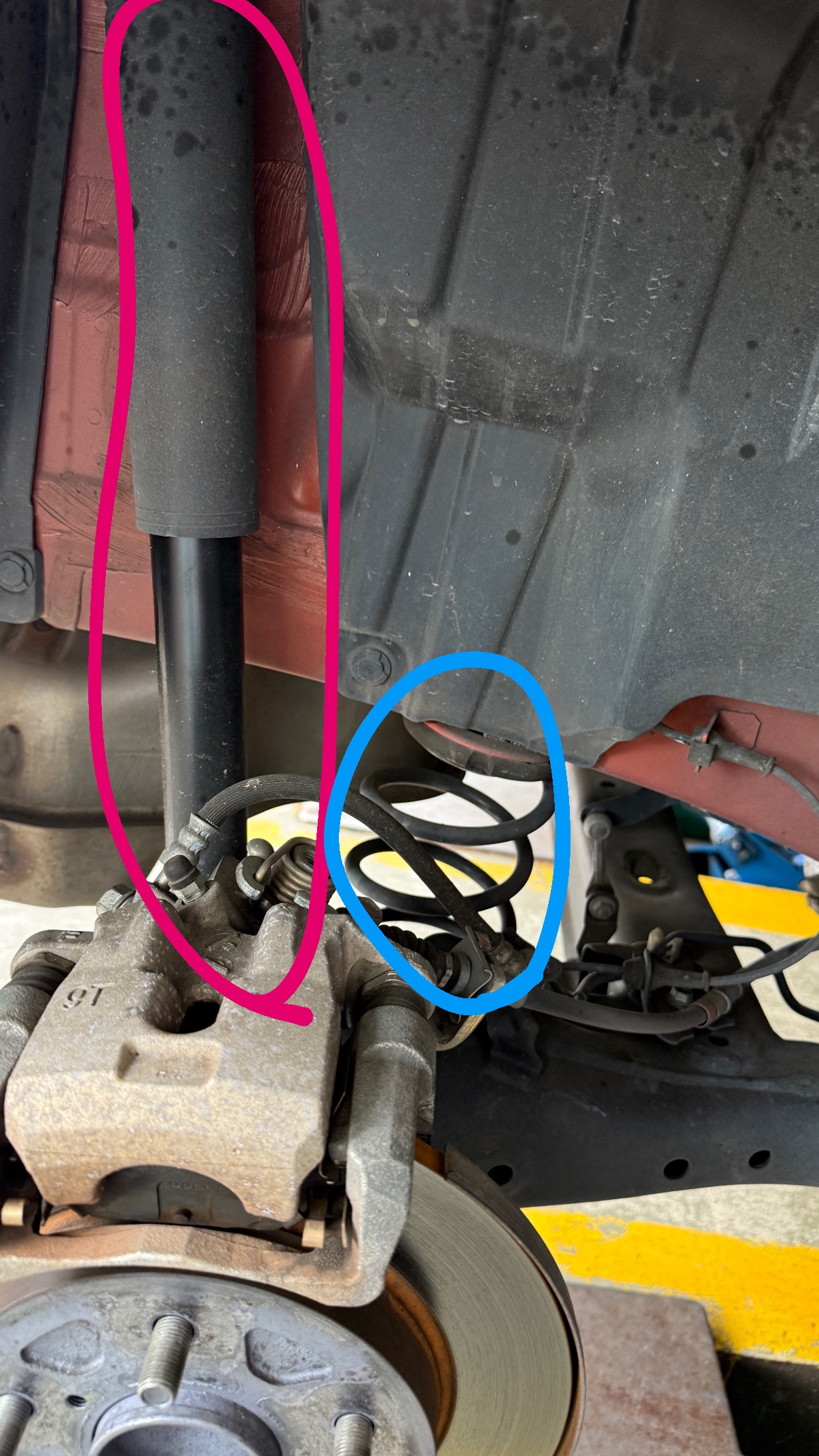 赤い丸がショックアブソーバ。青い丸がコイルスプリングです!!