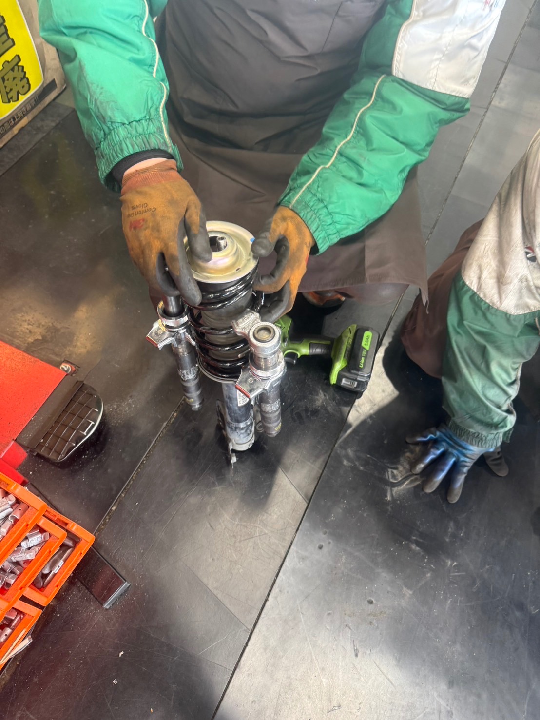 フロントのスプリングはストラット式とよばれるショックアブソーバと一体となっているので、専用工具を使用し、スプリングを縮めて脱着を行います!!