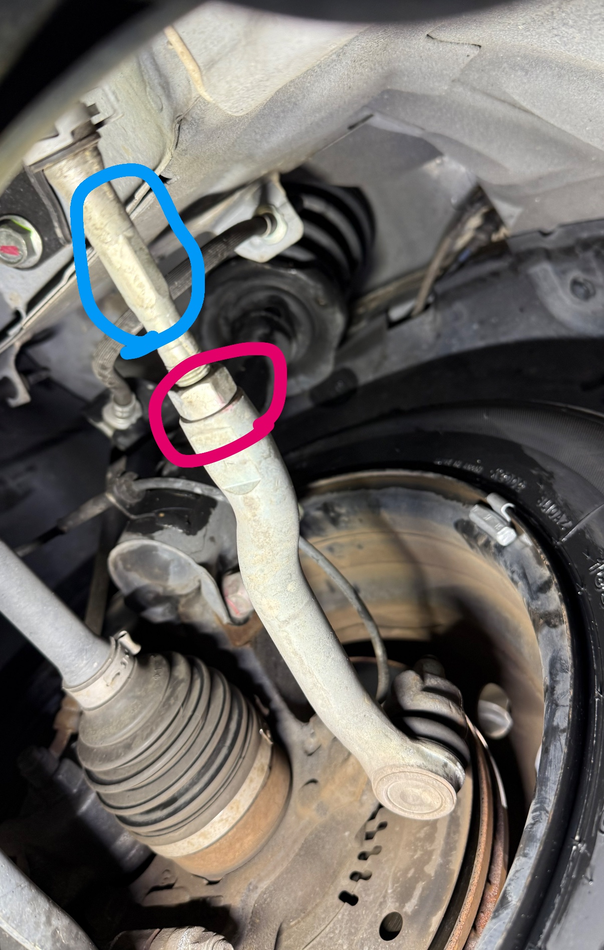 赤丸のナットを緩め、青丸の部品を回すことによって、部品全体の長さが変わり、ホイールの角度を調整することができます!