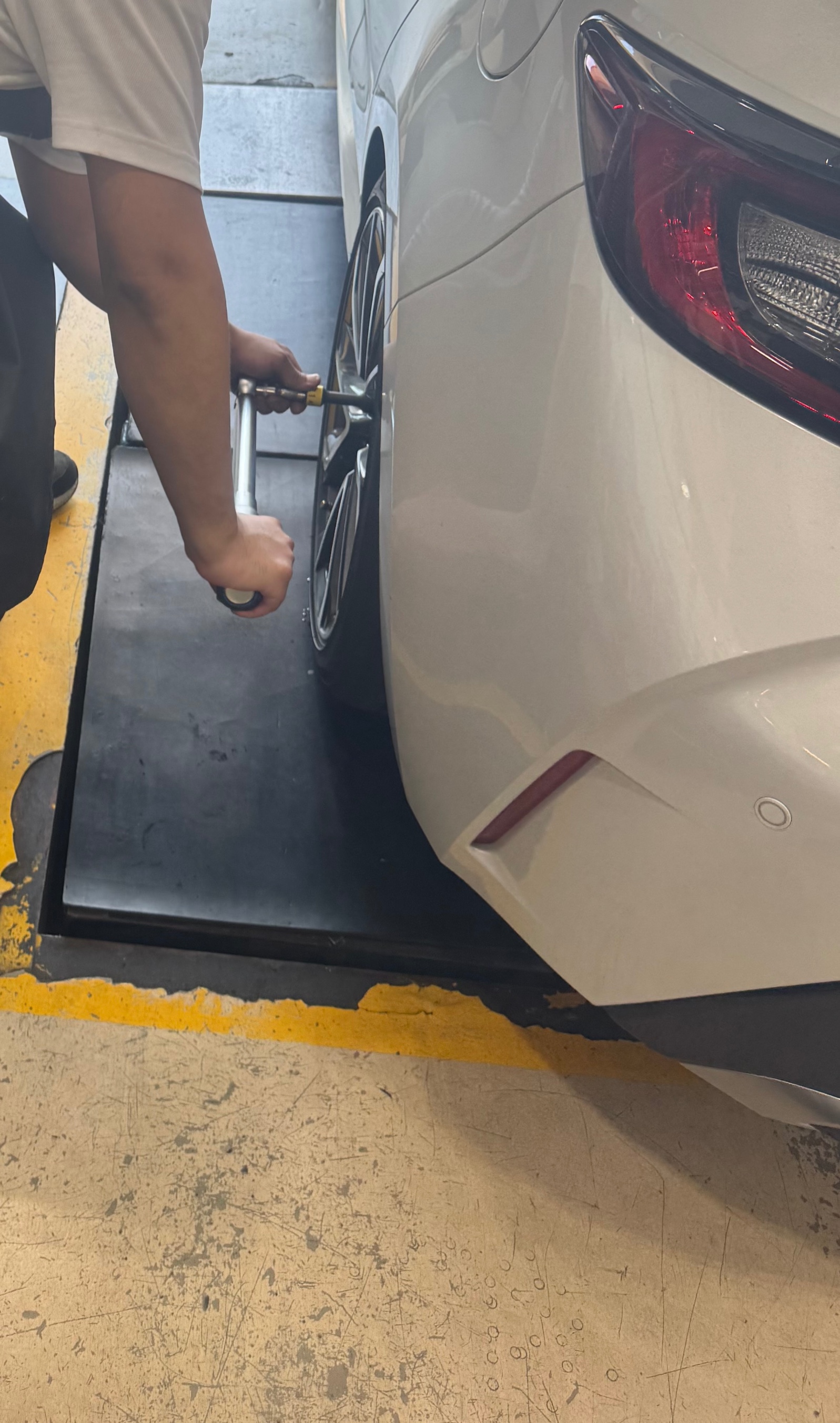 新品タイヤのホイールナットは、初期走行の環境変化等により、極まれに緩む可能性があります。専用工具を使ってチェックし、万一緩みがあった場合は、規定のトルクで増し締めを実施します。