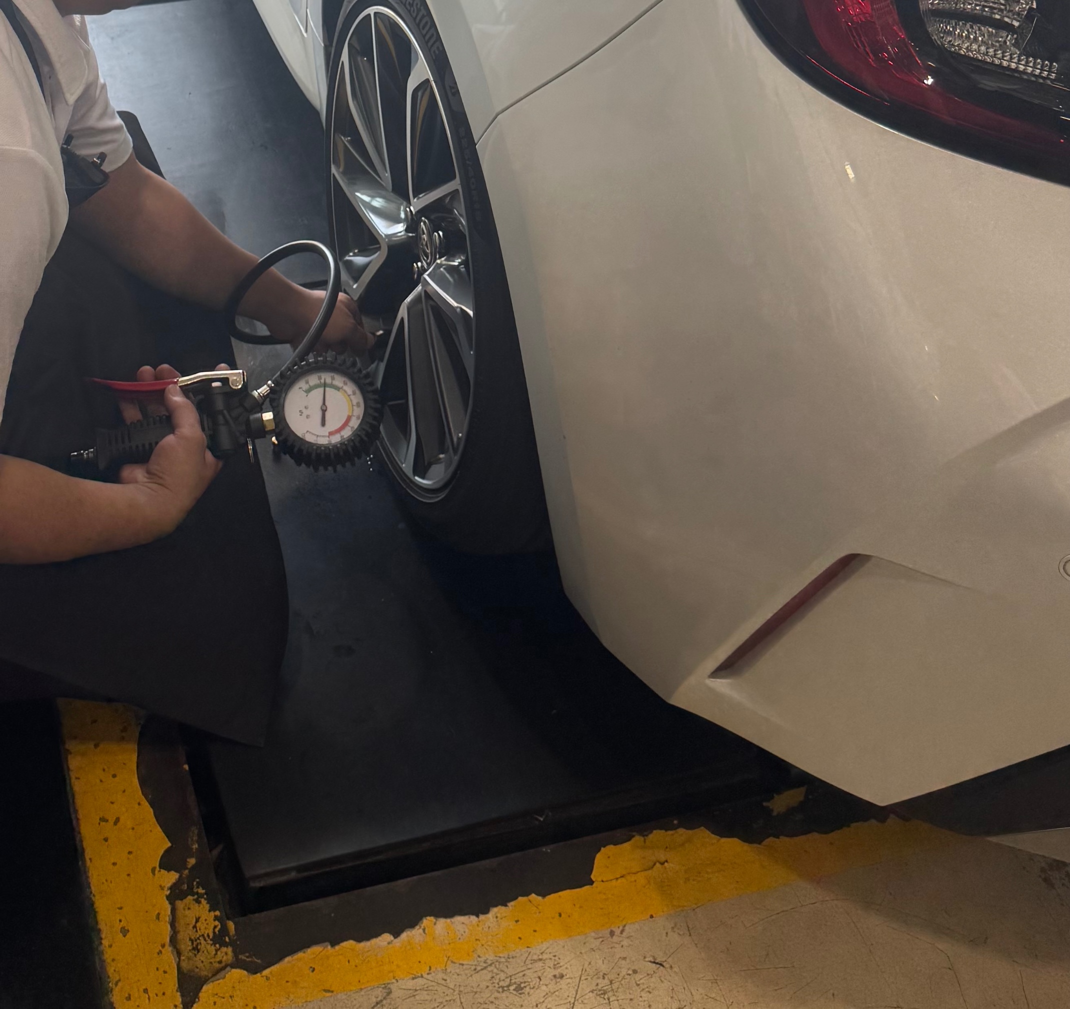 新品タイヤはタイヤがホイールになじむ過程で空気圧が低下する場合があります。偏ったタイヤのすり減りや燃費に影響を与えるタイヤの空気圧をチェックします。