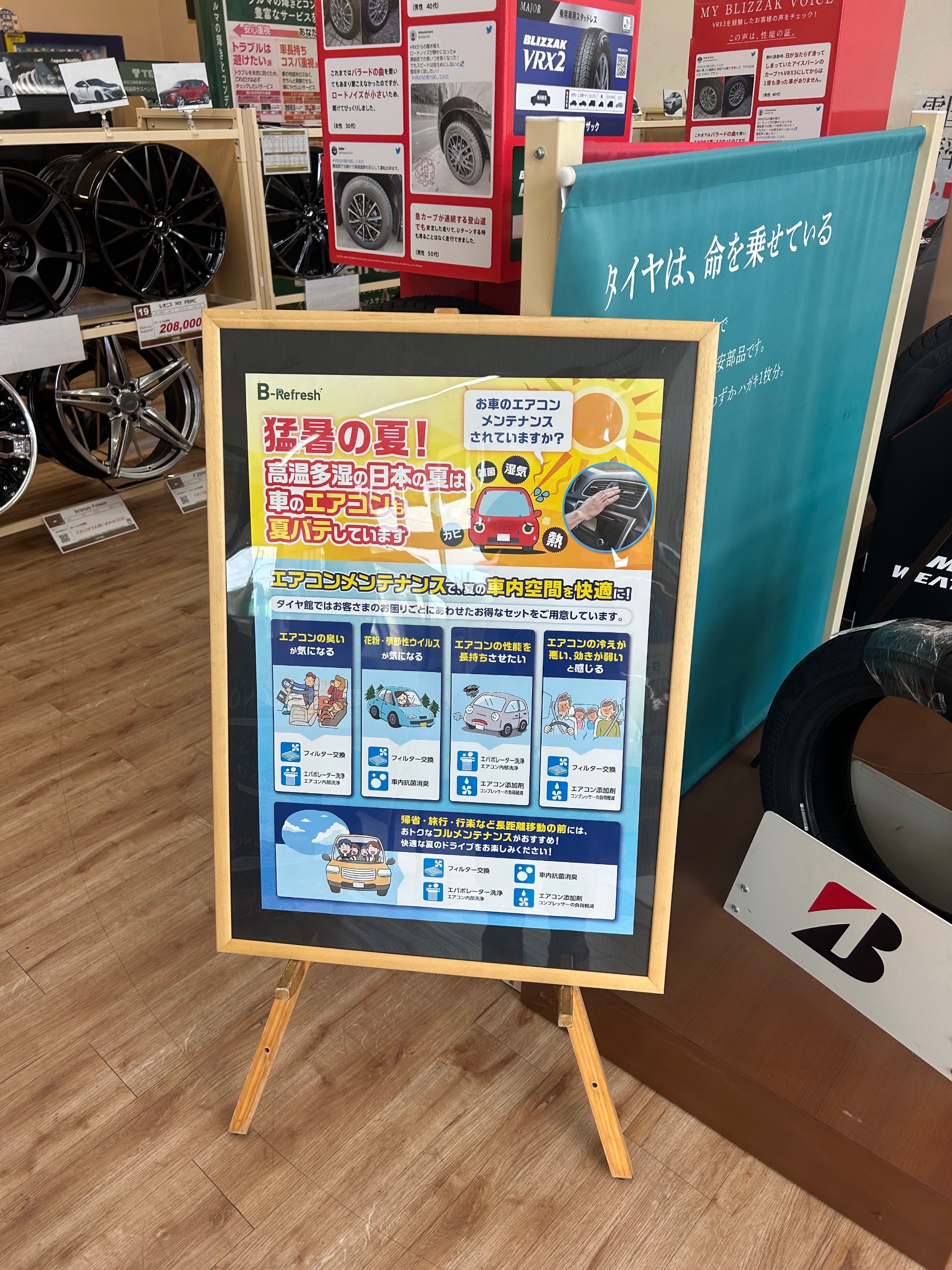 タイヤ館では、フィルター交換・エバポレーター洗浄・ガス添加剤注入など、状態に合わせたエアコンメンテナンスをご提案。