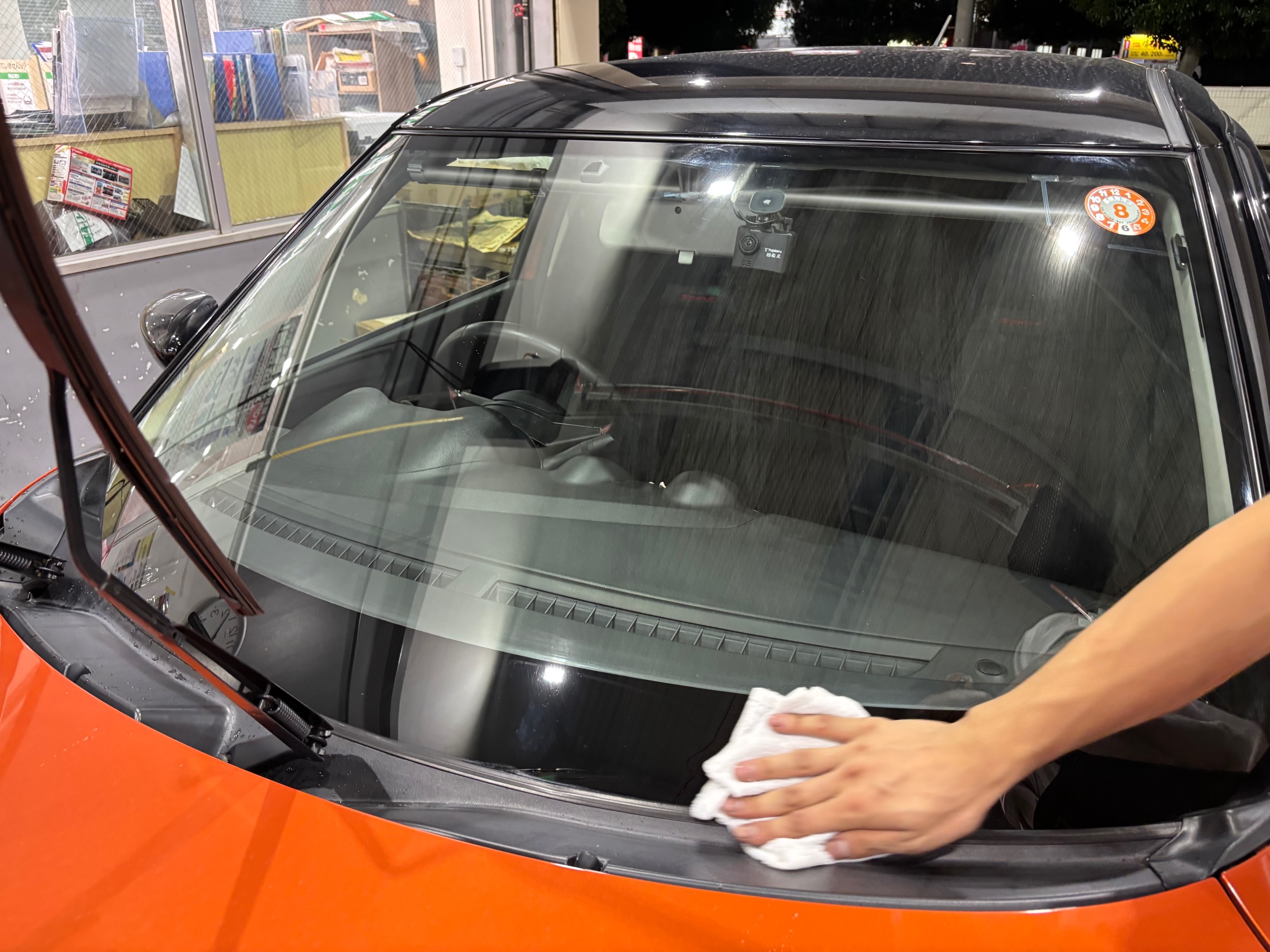 最初に撥水剤をフロントガラス一面に塗り広げます。