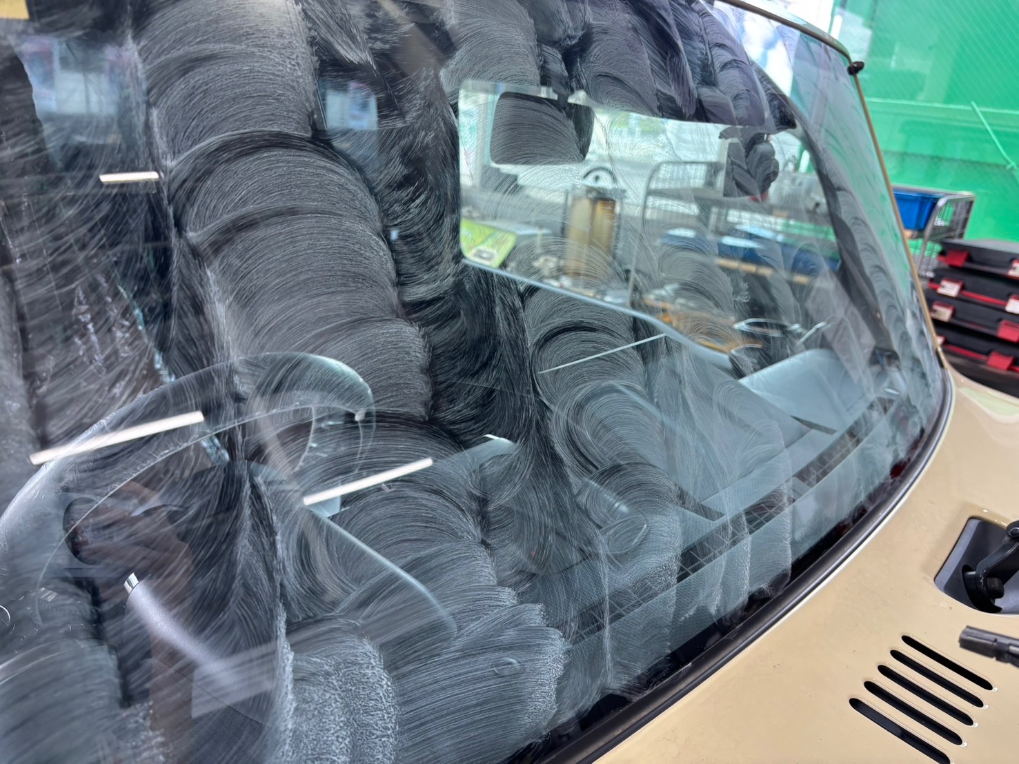 ガラス表面の汚れや油膜を丁寧に落とすことで、コーティングの密着性と耐久性がUPします。