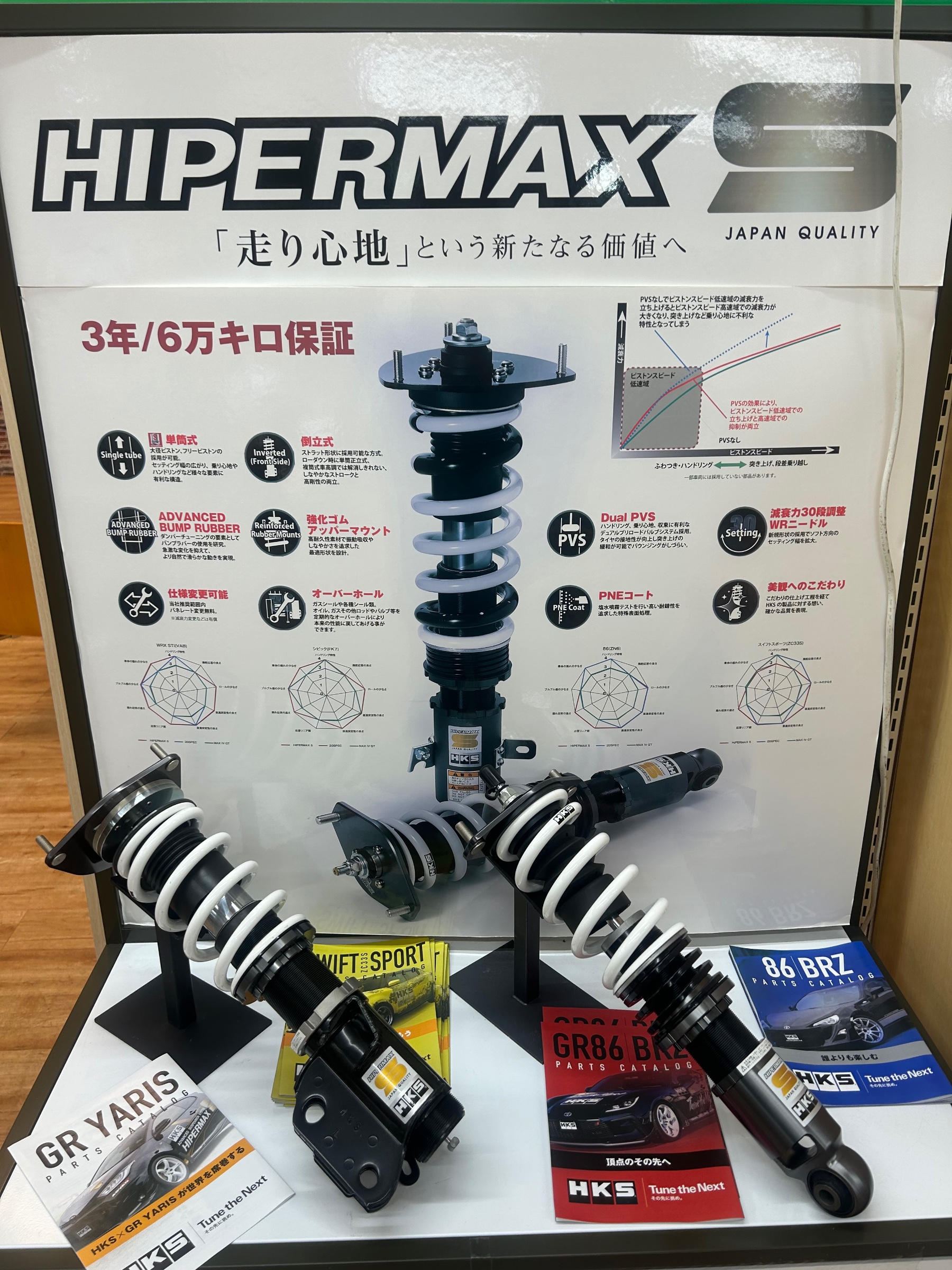 HKSのHIPERMAX Sは、街乗りでもワインディングでも快適に走れる車高調です。