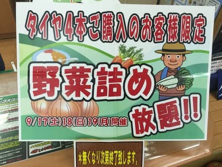 タイヤ4本購入のお客様に野菜の詰め放題実施中です^^
