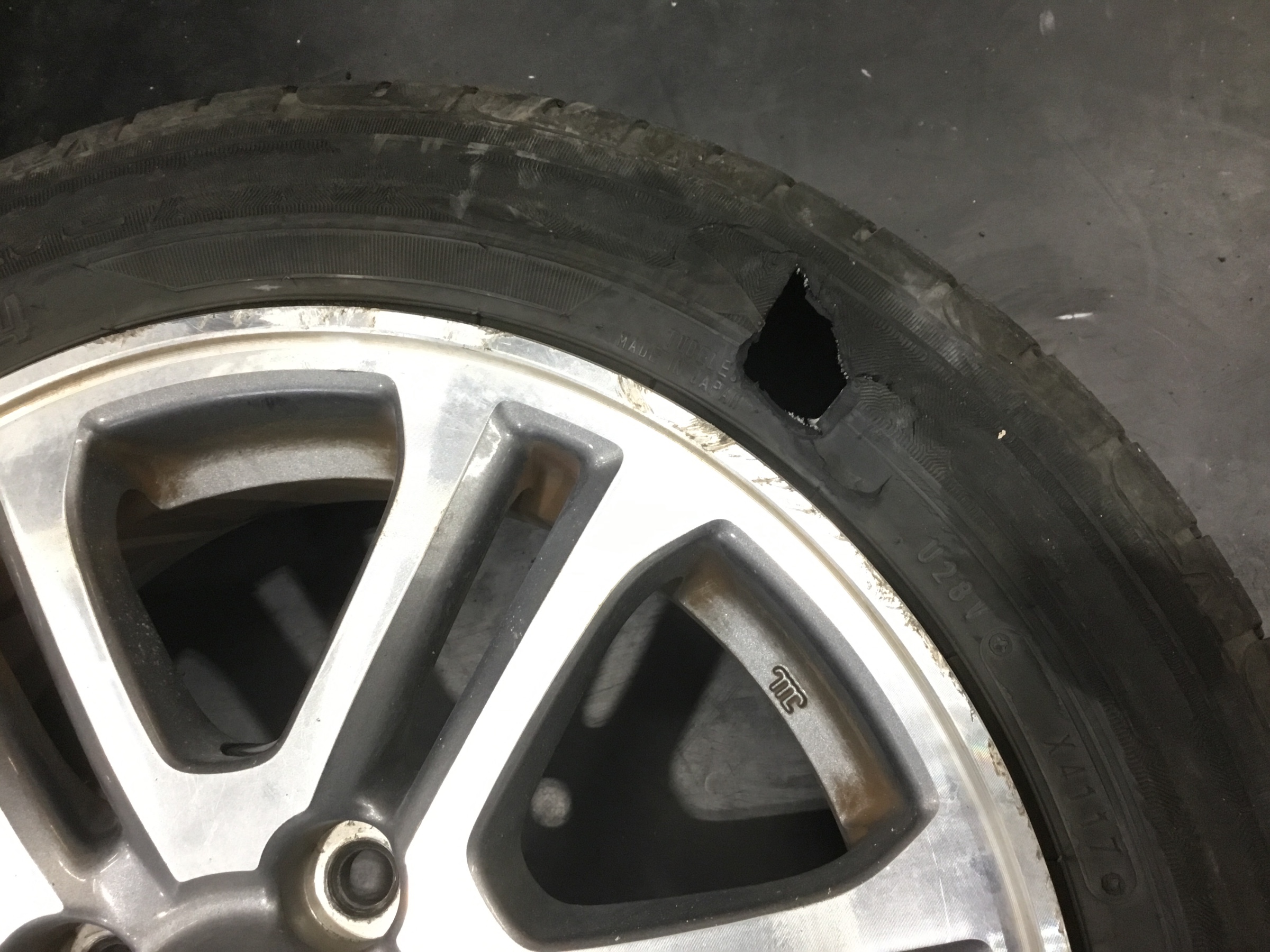 タイヤバーストの主な原因としては、縁石などに強くぶつけてしまったり、空気圧が低い状態で長時間走行してしまった場合などに突然破裂してしまうんです、、、