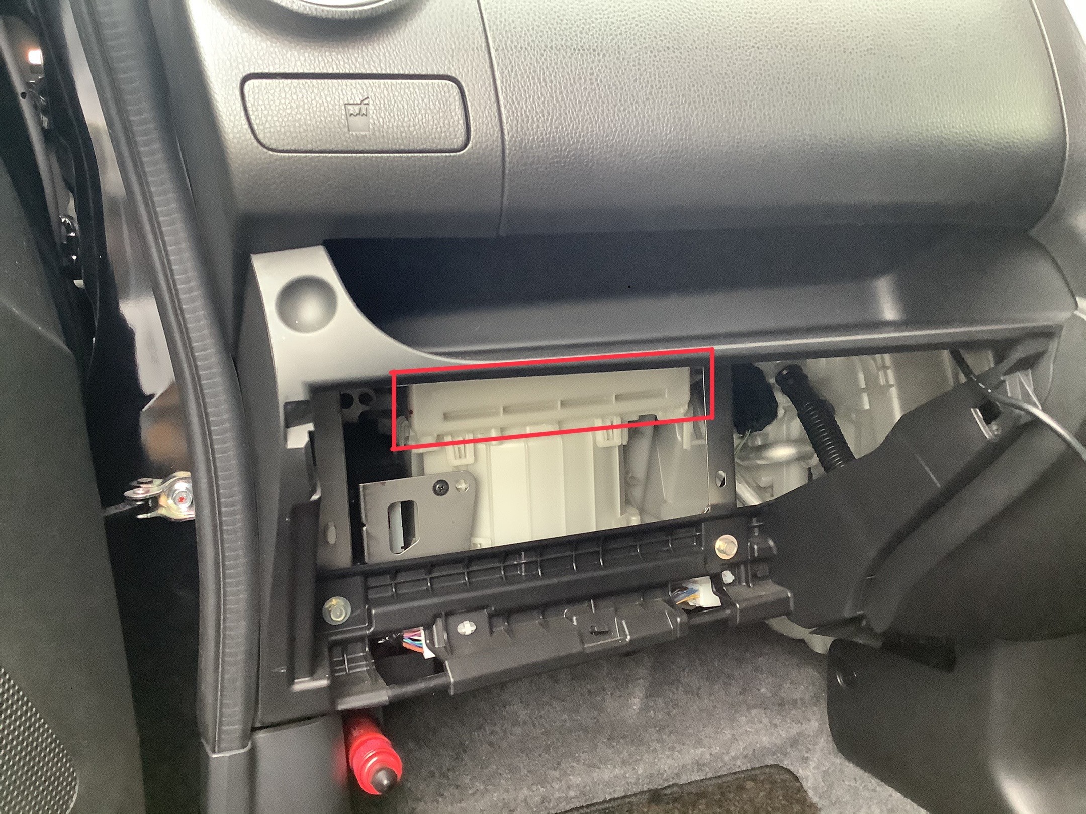 基本的には、助手席のグローブボックスを外した奥にエアコンフィルターが設置されています。