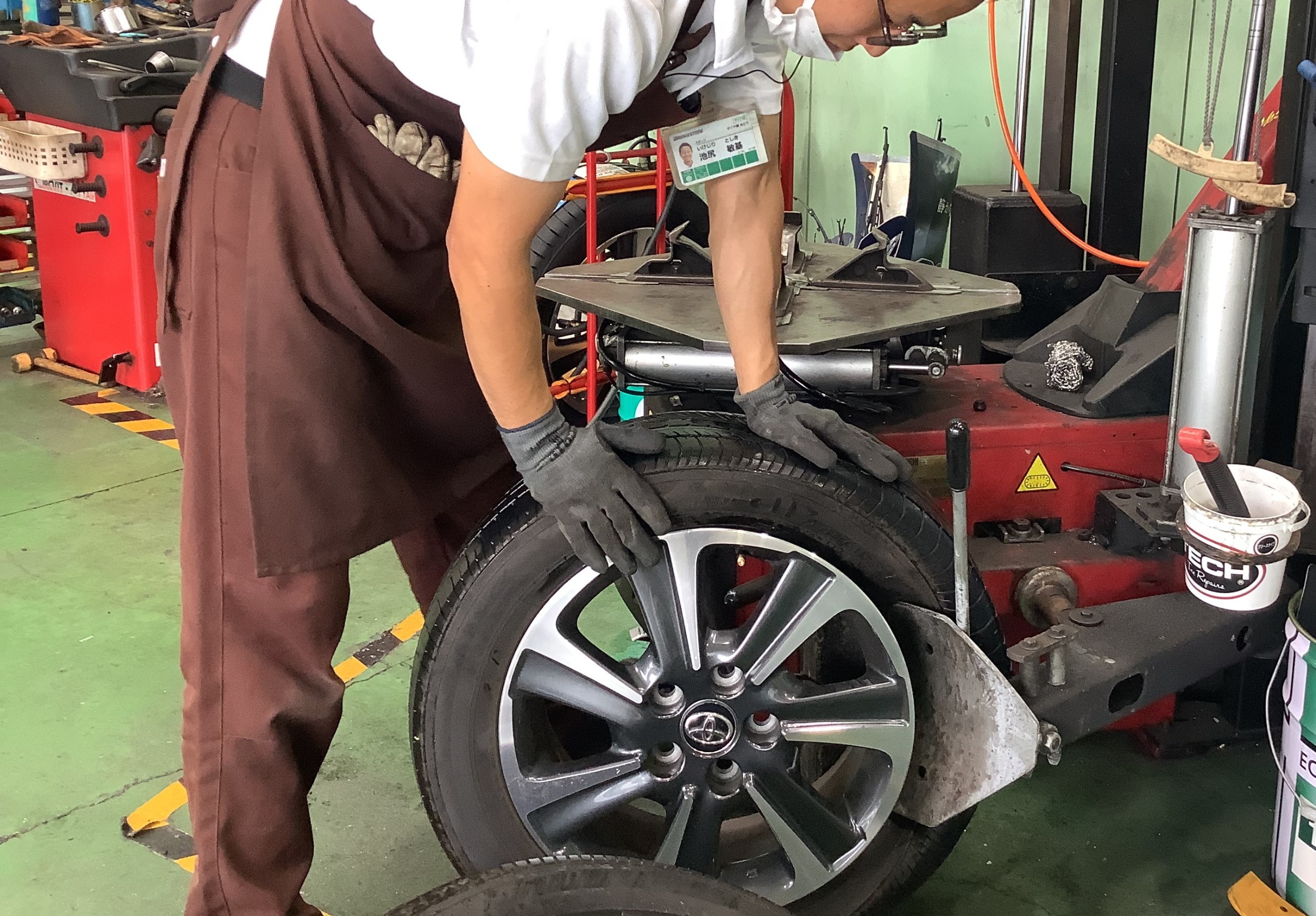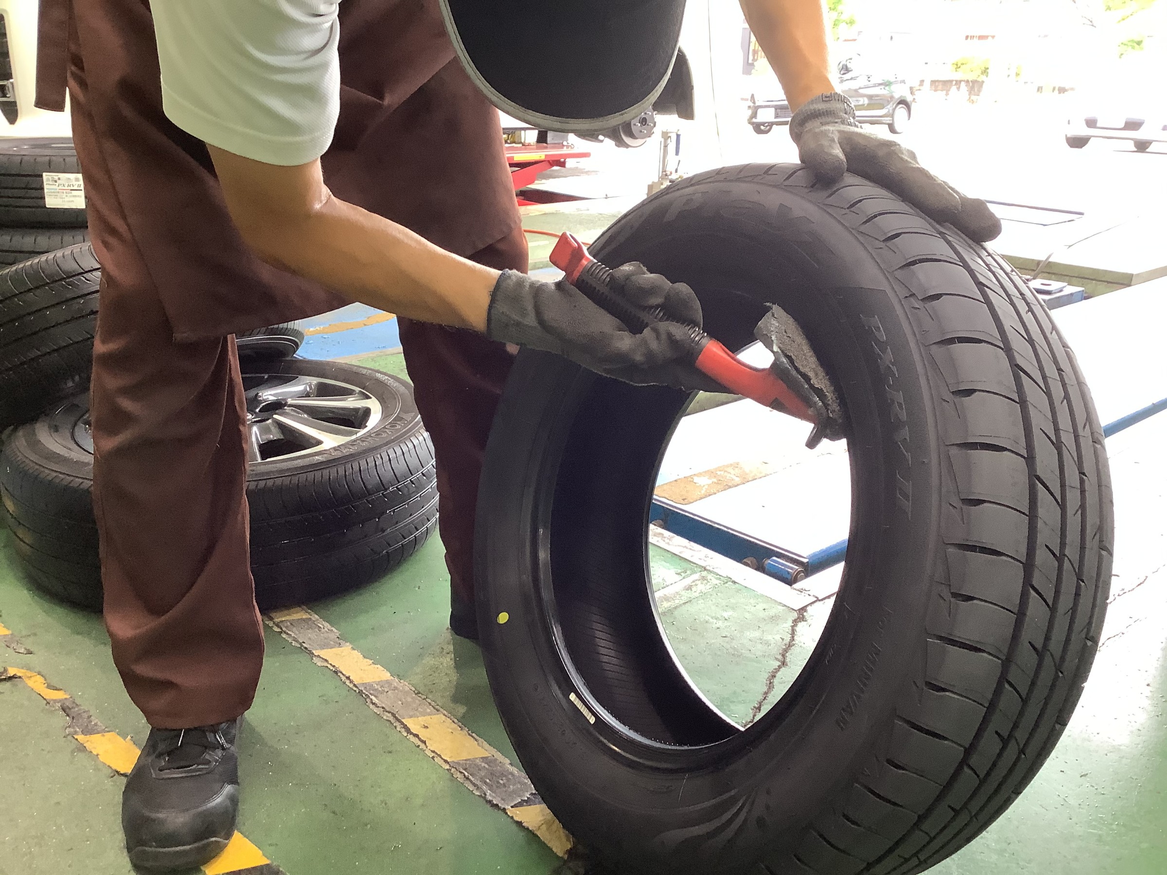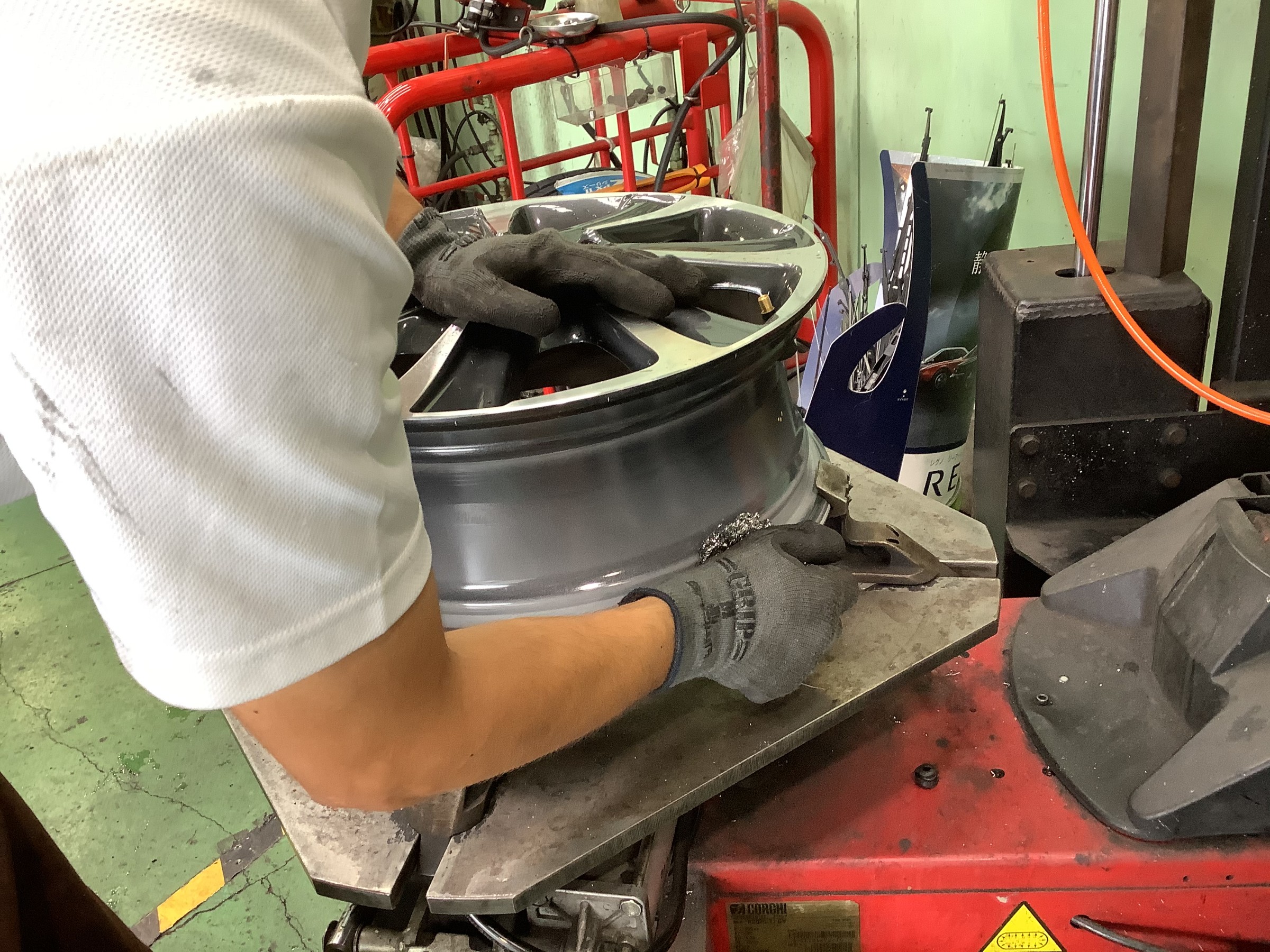 新品タイヤを組み込んでいきます!池尻スタッフは力があるので手組みです(笑)