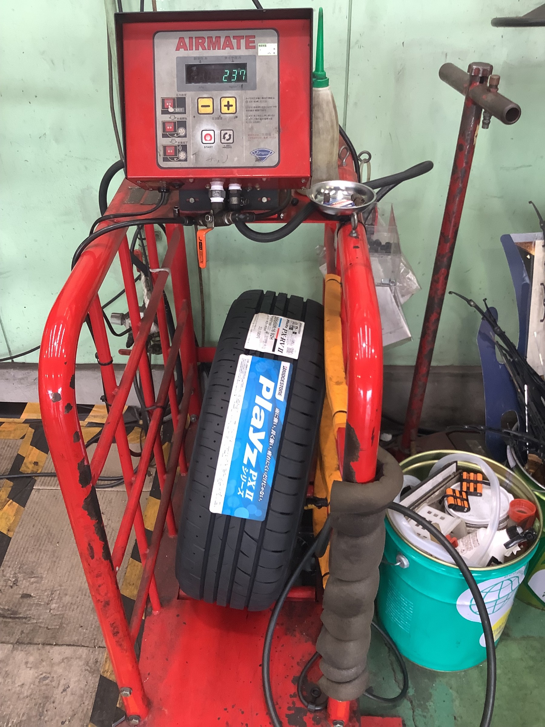 この充填時に破裂して事故の恐れがある為、タイヤ館では安全策として柵の中に入れて充填しています!
