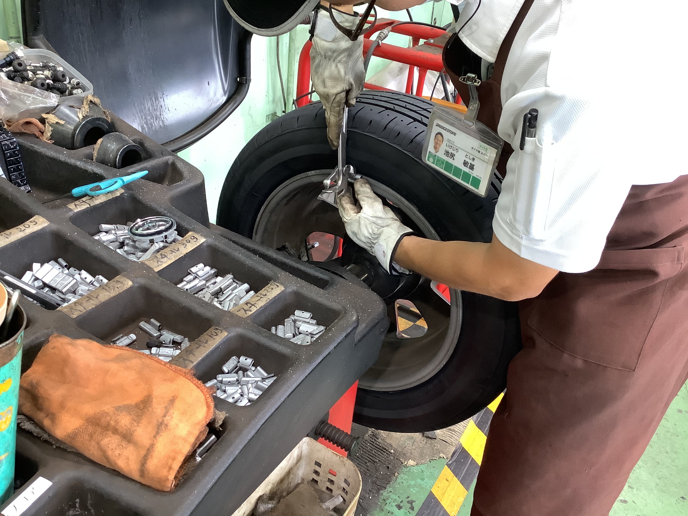 バランサーでホイールバランスをとってウエイトを打ち込み(貼り付け)していきます。