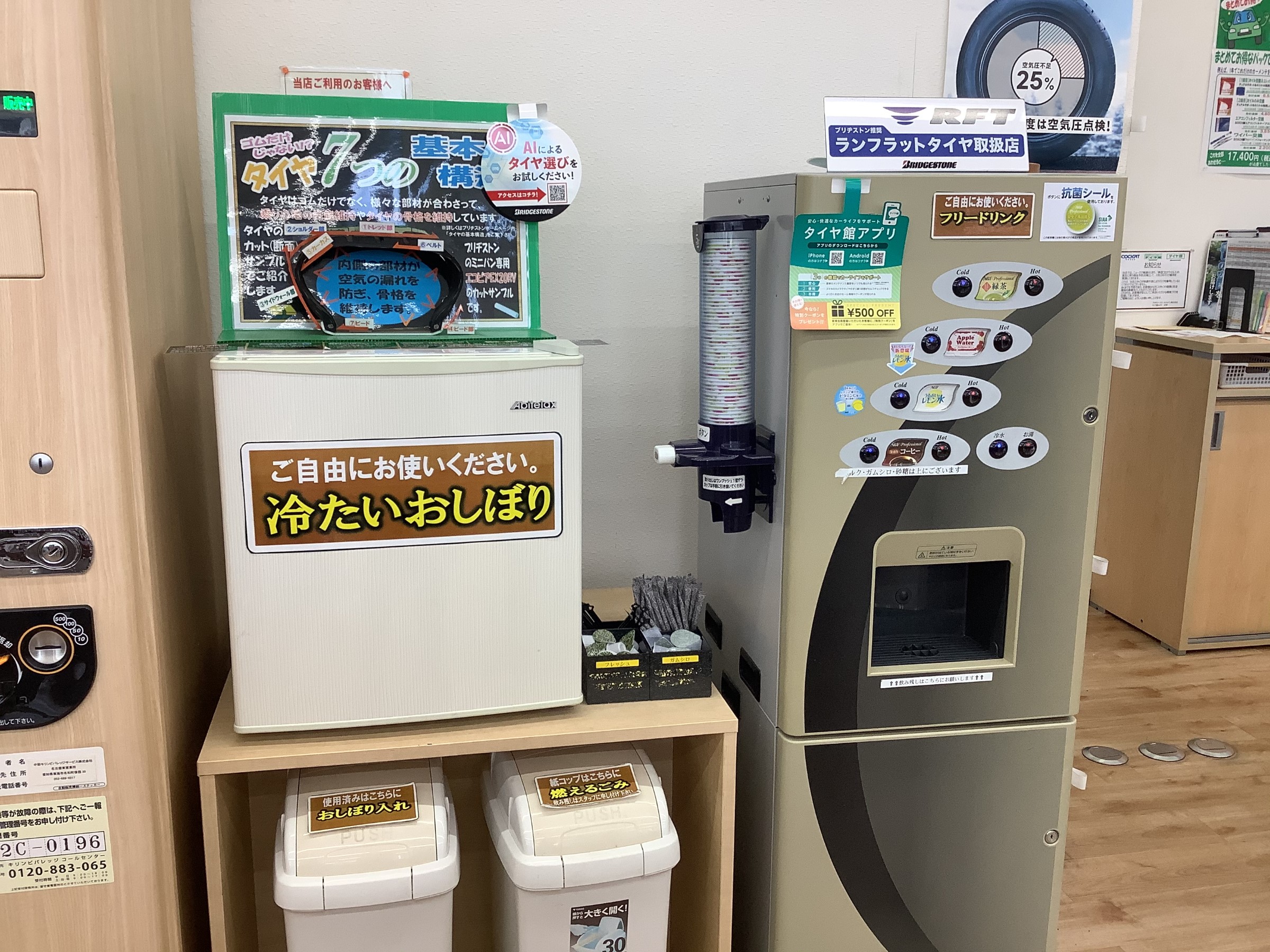 お出かけ前や後、ちょっとした隙間時間などに…空気圧点検や安全点検をして、フリードリンクでほっと一息つきませんか?