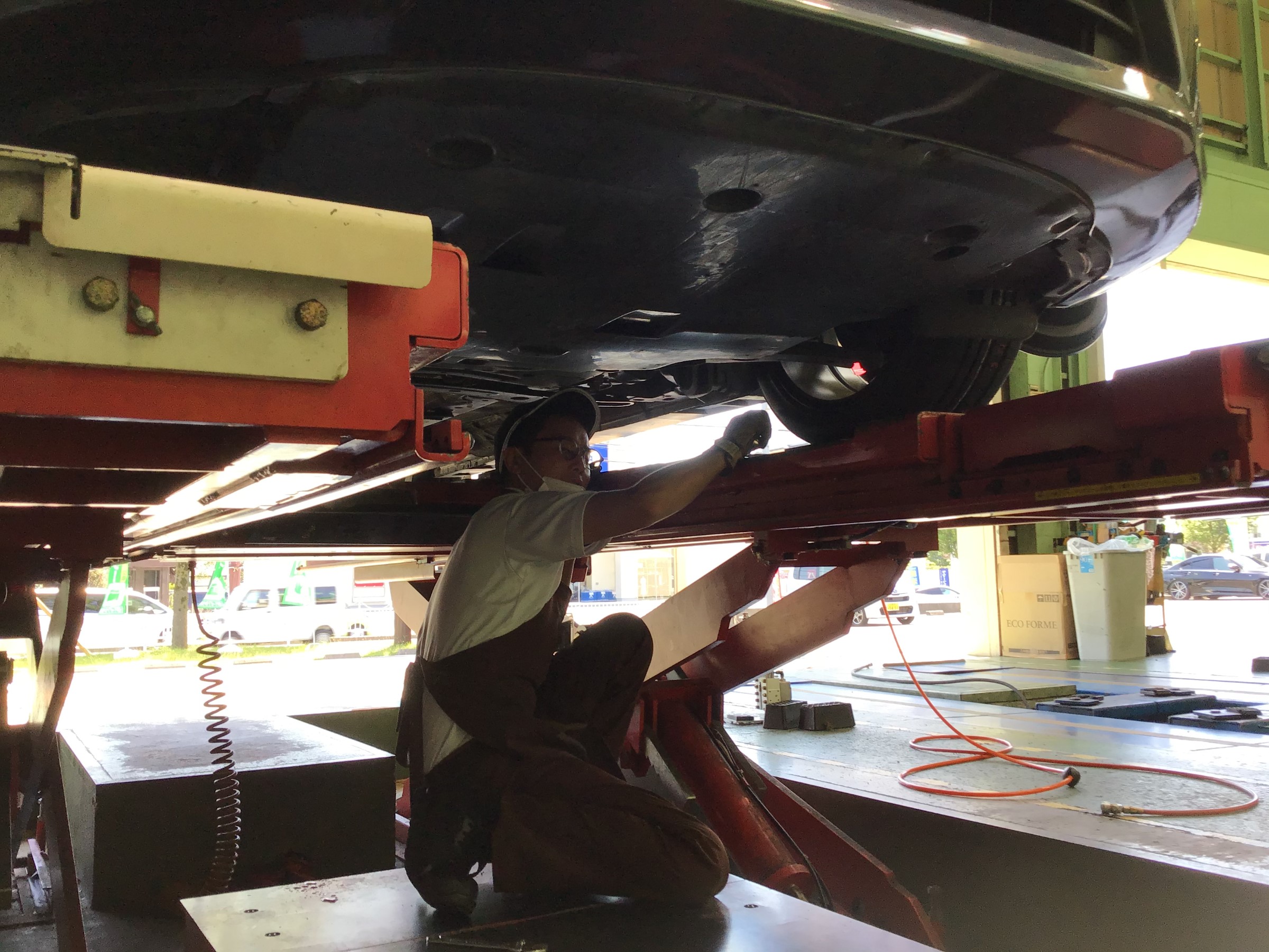 センサーを取り付け、下に潜り込み調整いたします!