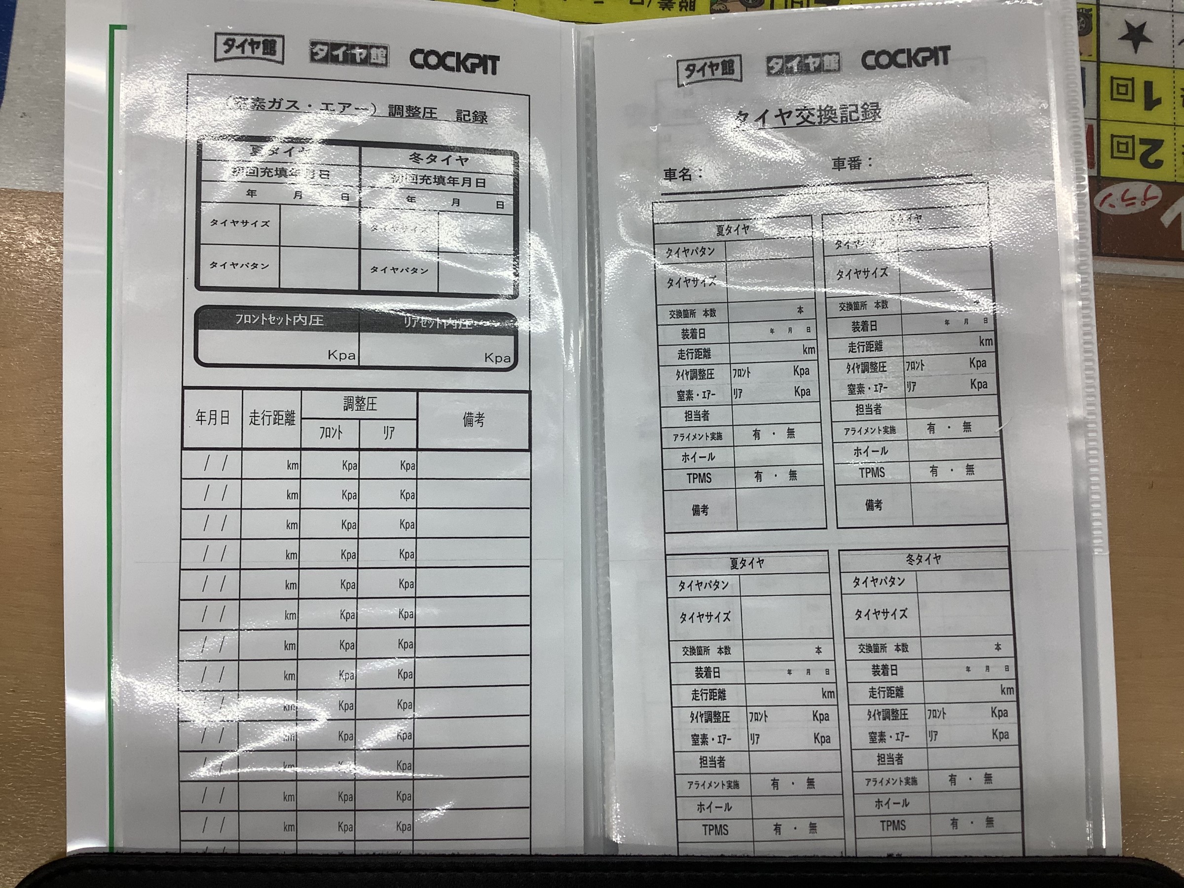 タイヤ購入履歴のほかにも、空気圧点検やメンテナンス用品の交換履歴も記入しています。