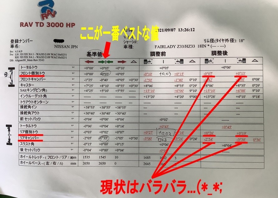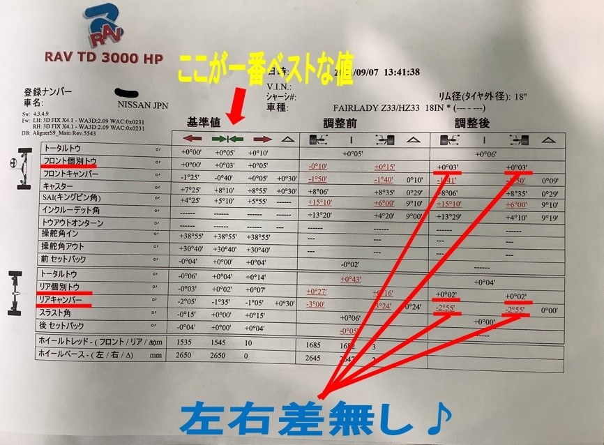 全てのトウはしっかり基準値で調節して、リアのキャンバーは右側を左右差無しまで起こしました!