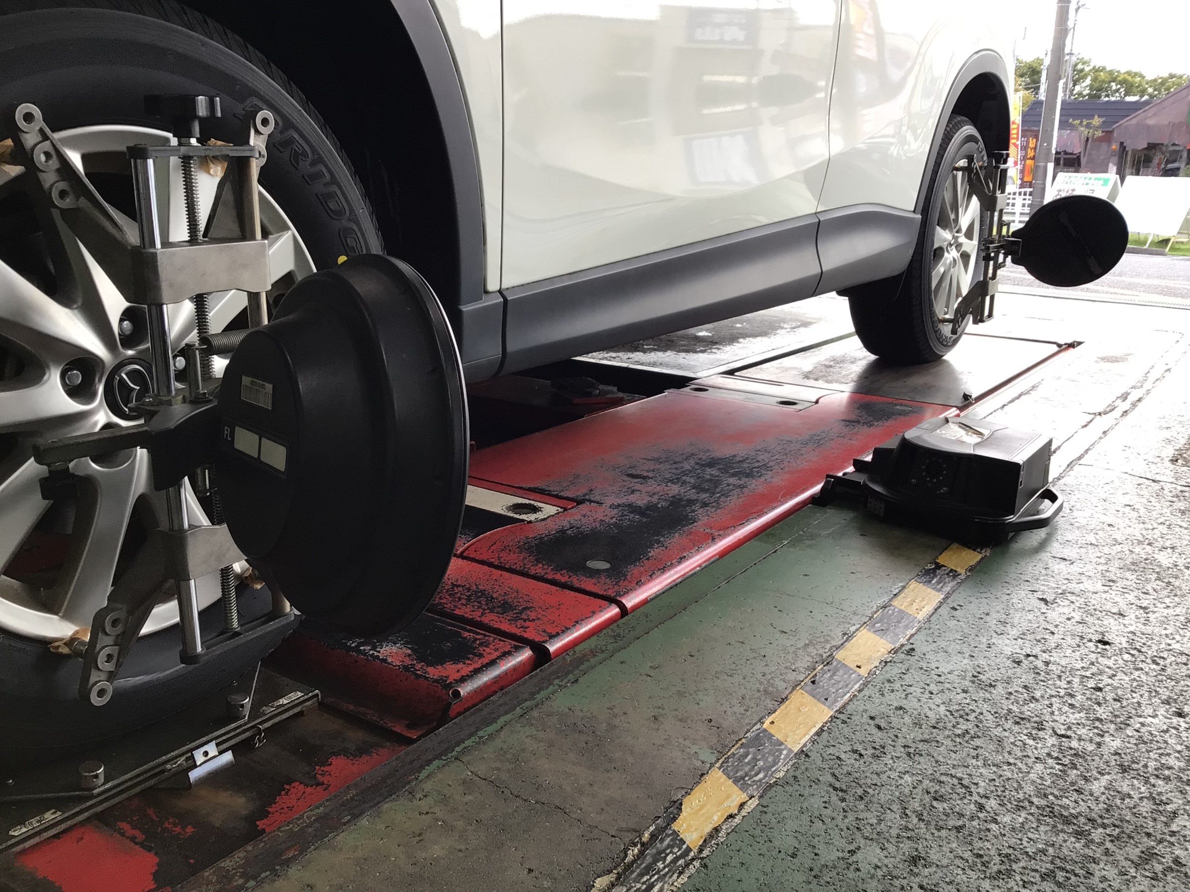 車体に新しいタイヤを取り付けたら、アライメント作業に移っていきます。