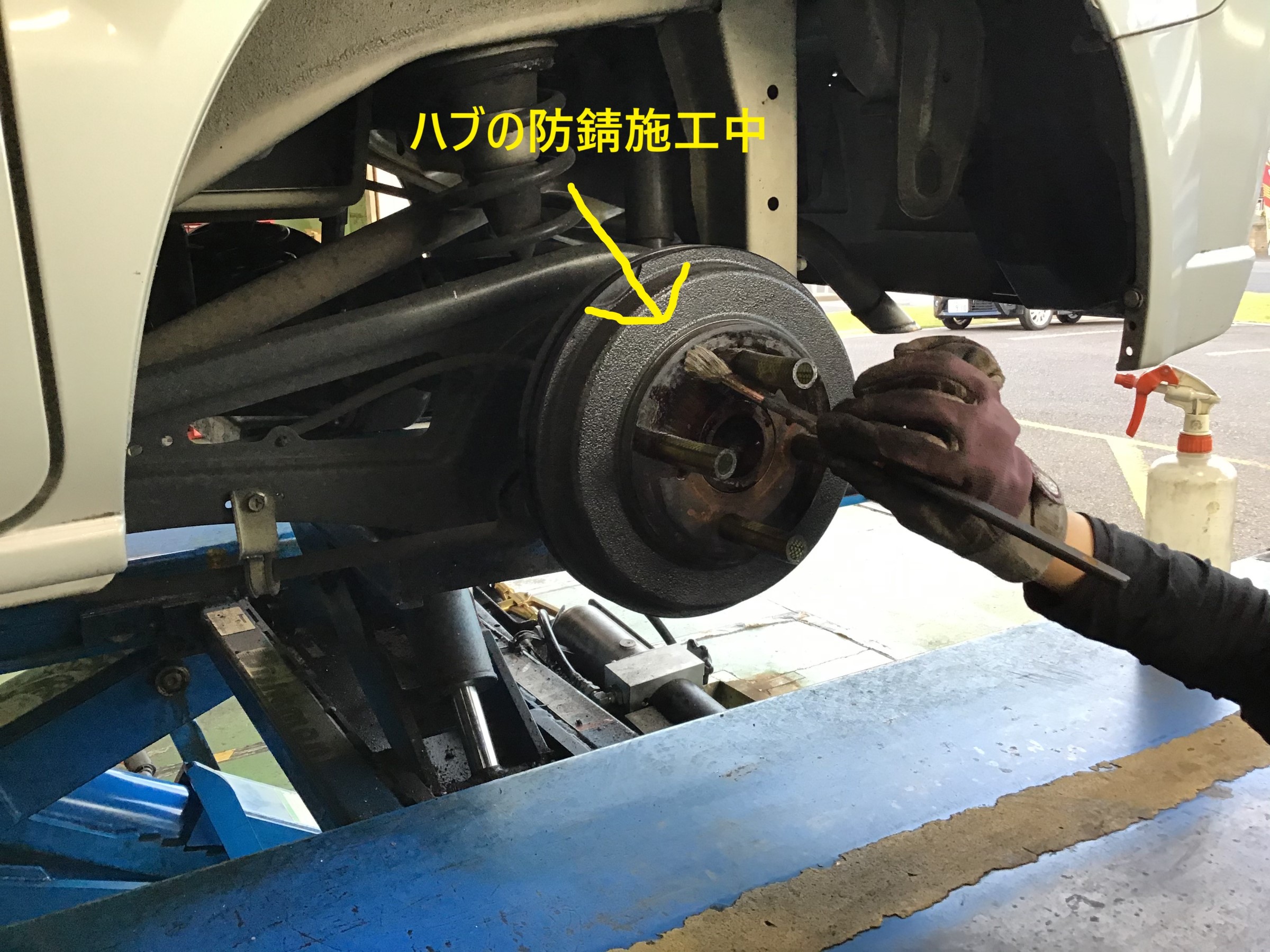 当店の看板娘によるハブ(タイヤの取り付け位置)の防錆施工中です!