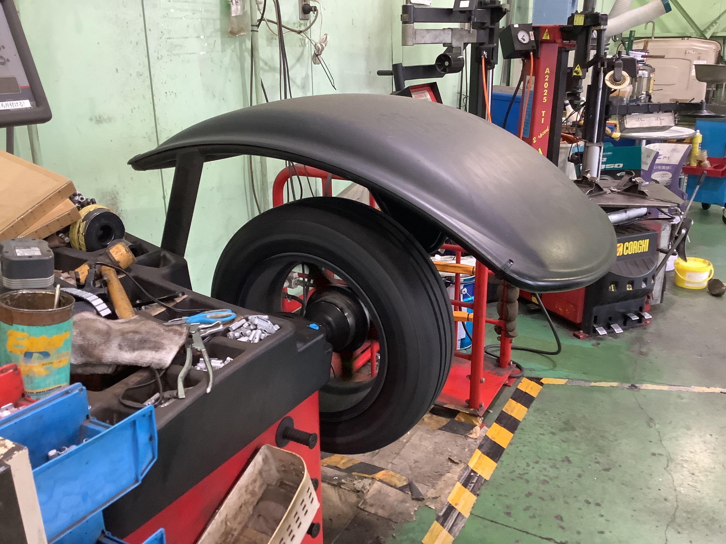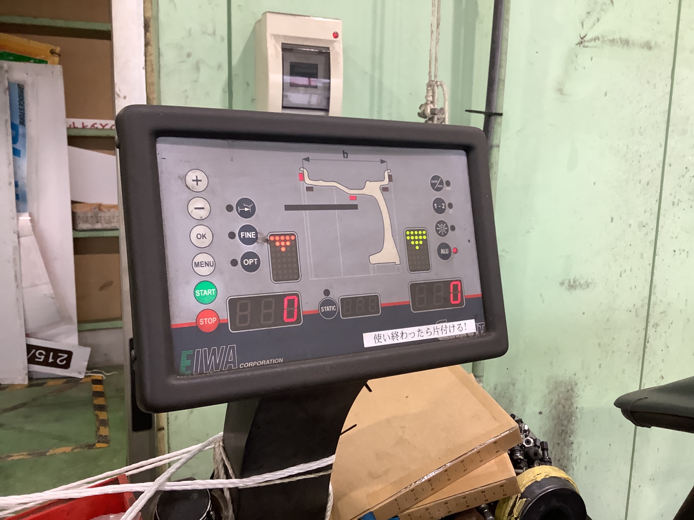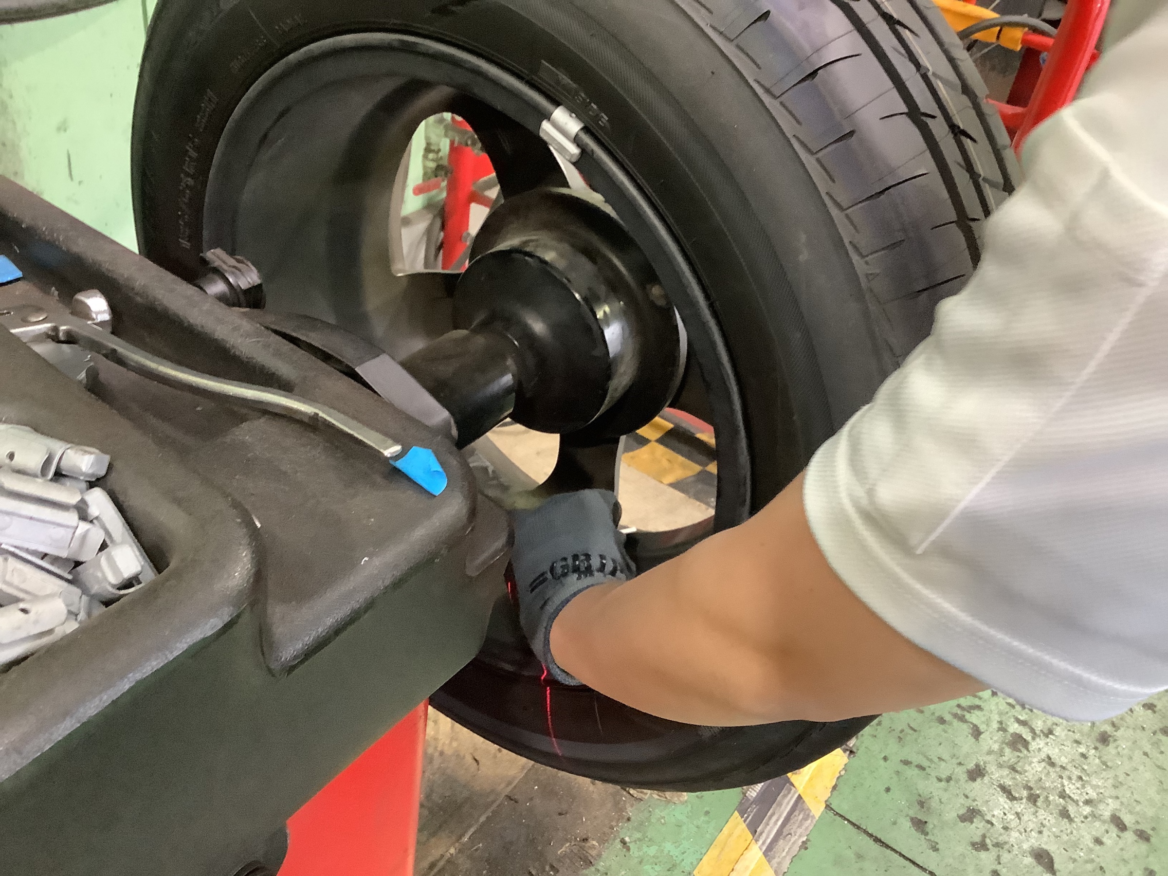タイヤのバランス調整の様子です。専用の機械にセットしてタイヤを回転し、バランスのズレを調べます。