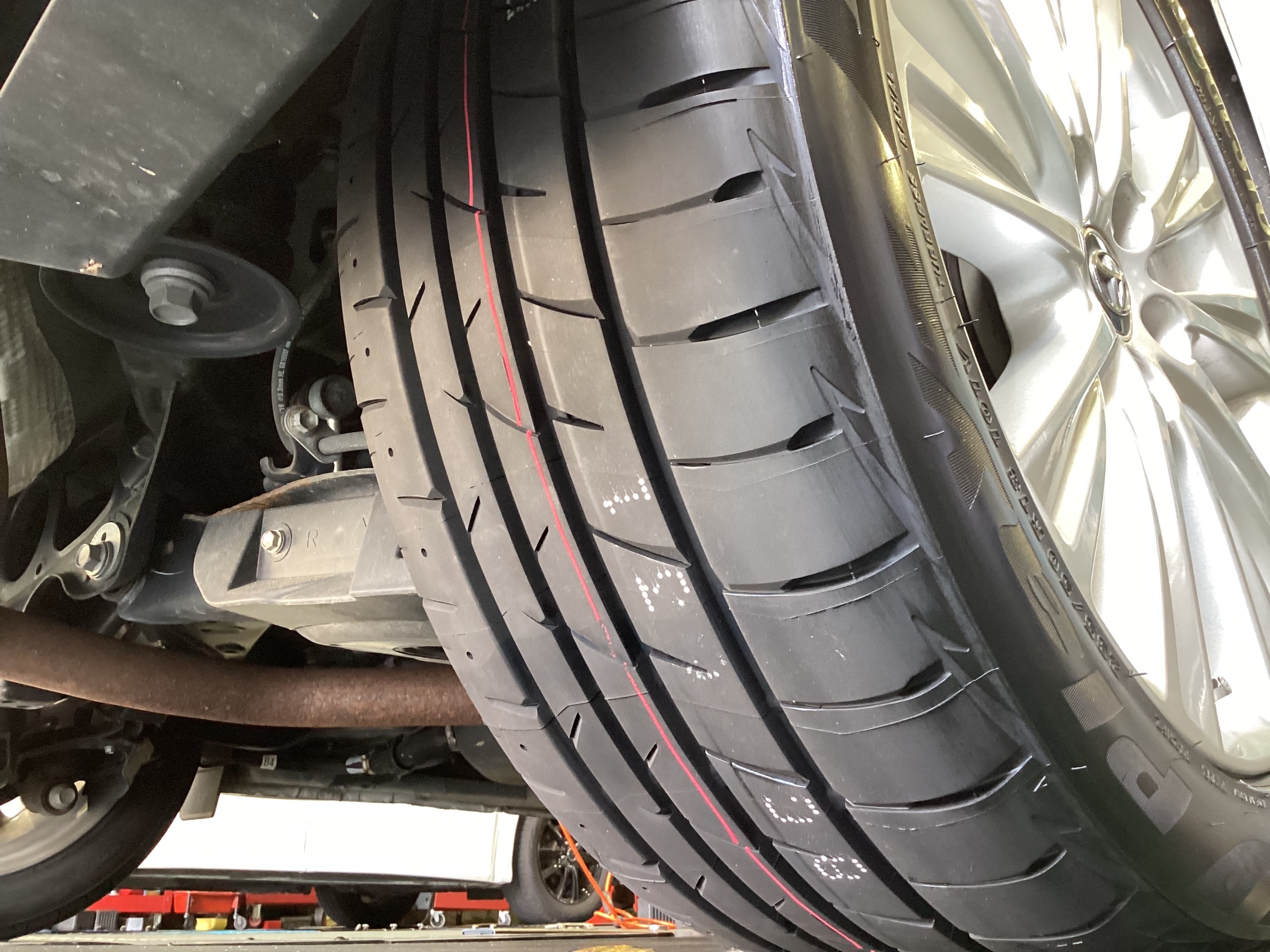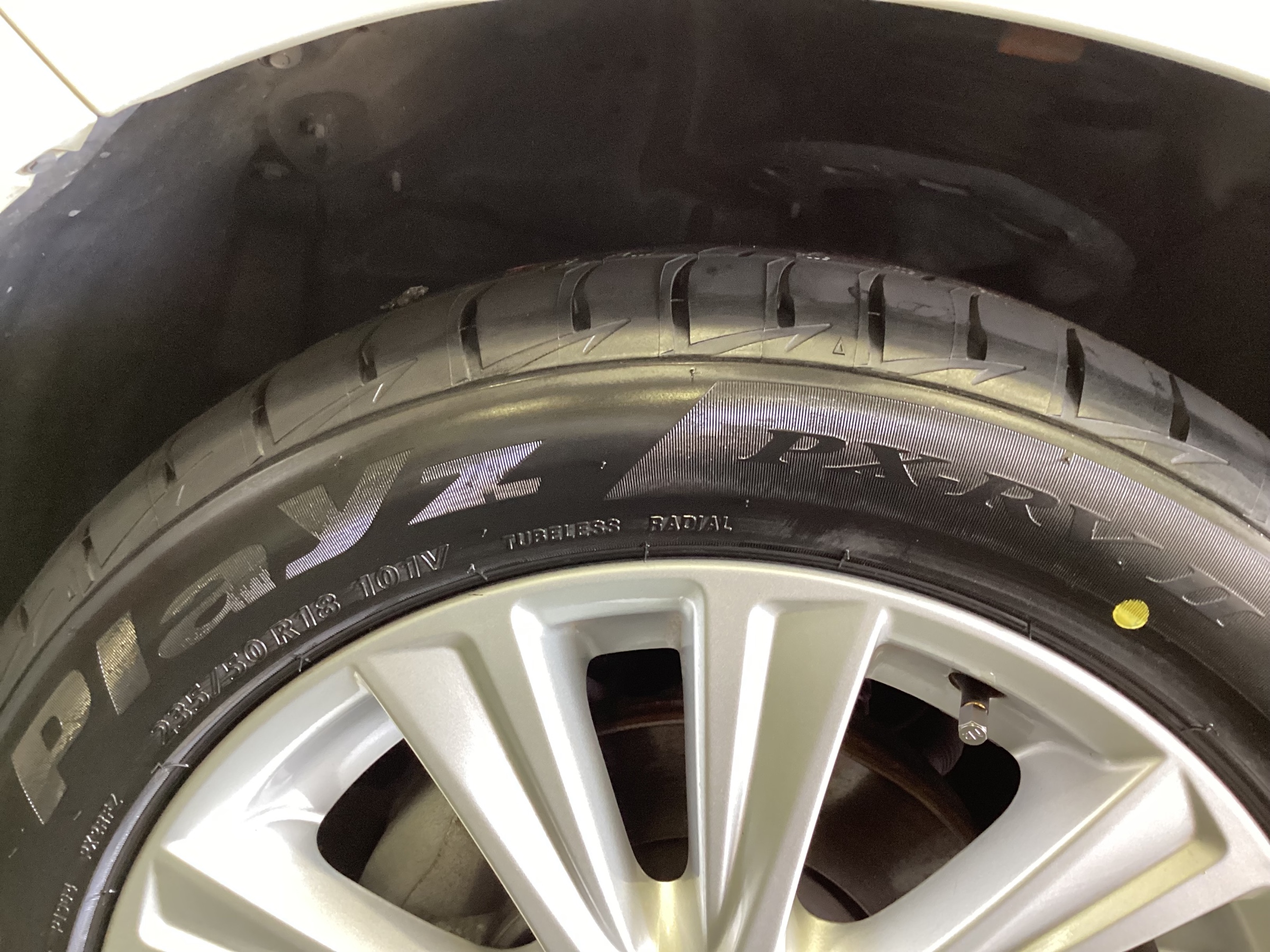 アルファードのタイヤ4本交換作業です。新車から装着していたタイヤが約25,000km走行してすり減ったため、ブリヂストンのミニバン専用タイヤの「Playz PX−RVⅡ(プレイズ)」に交換。