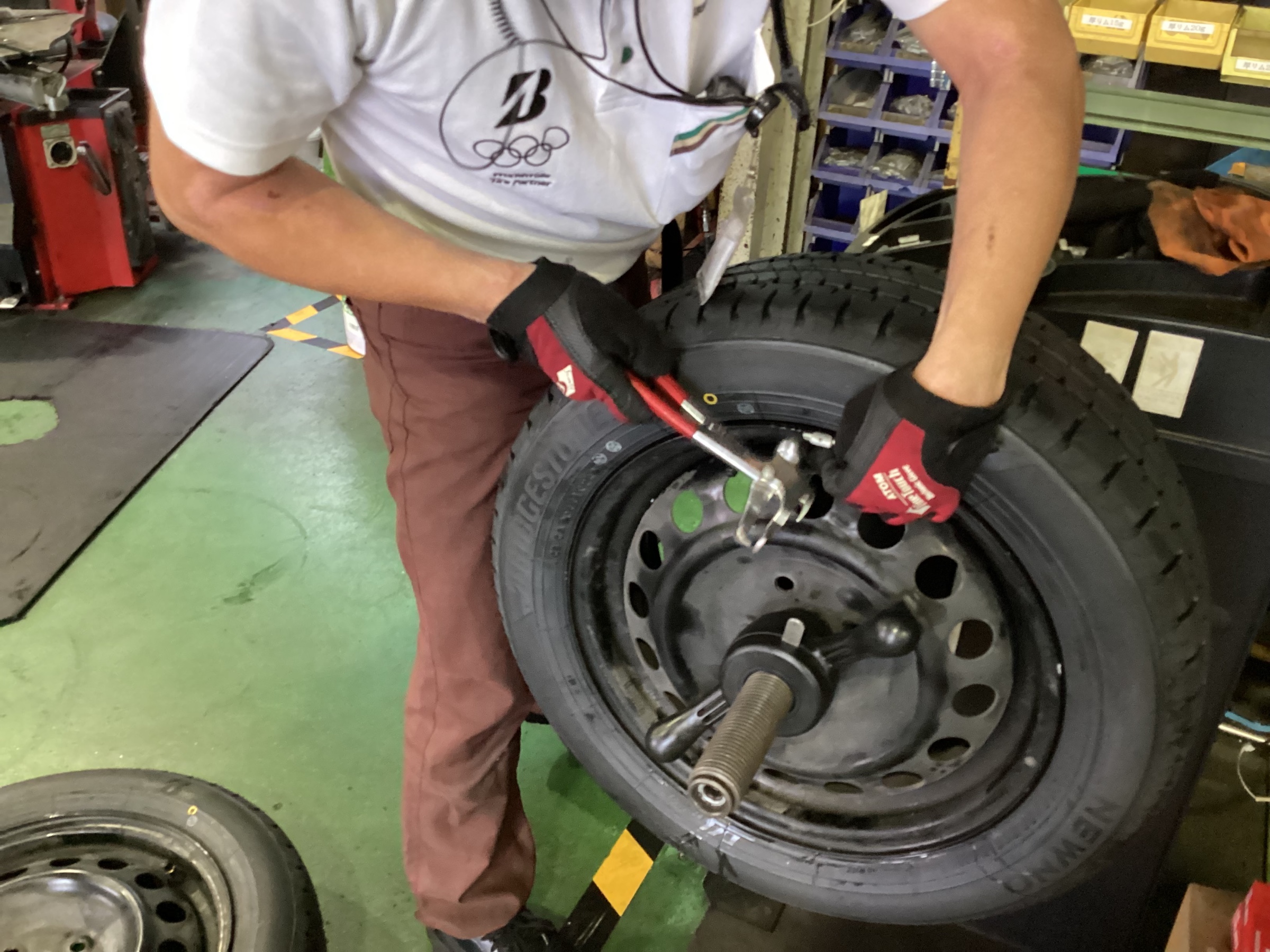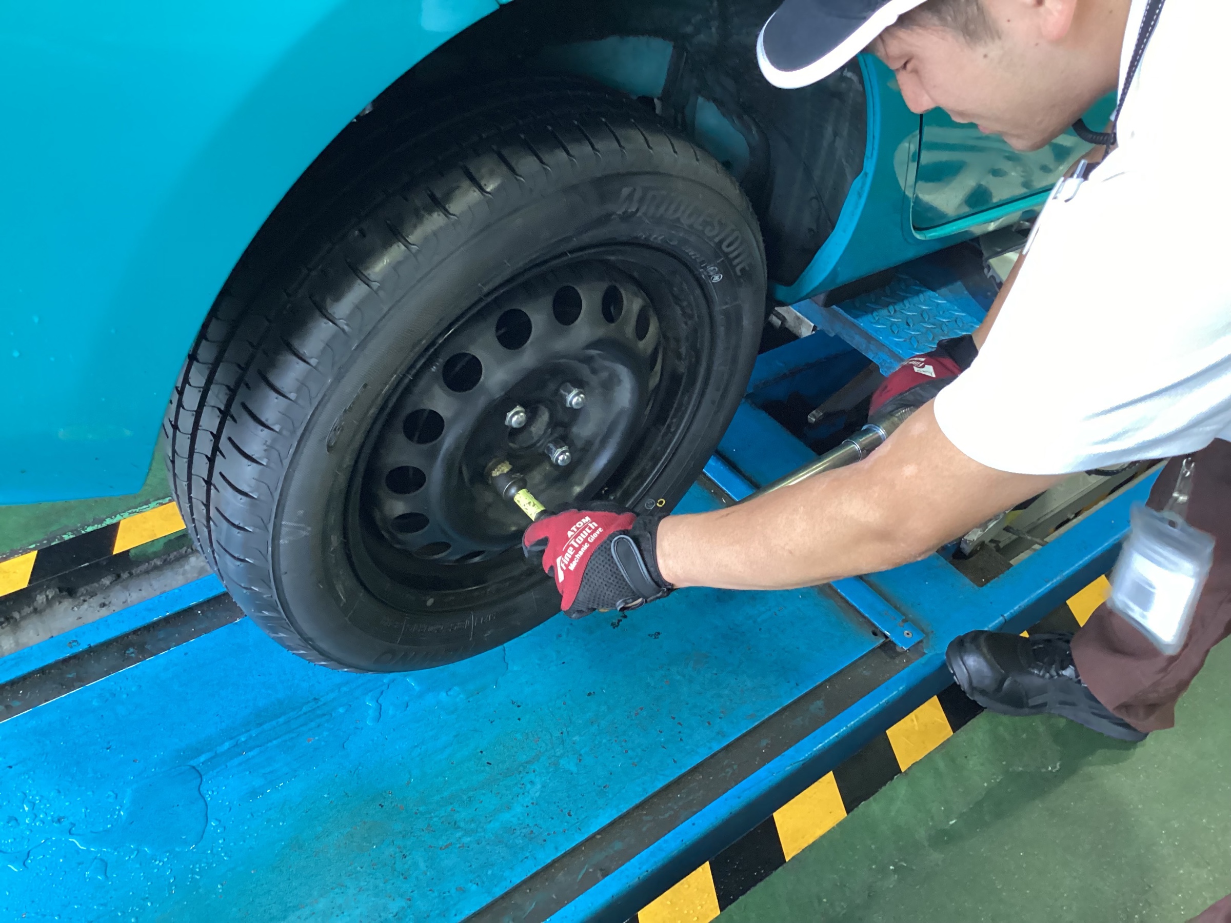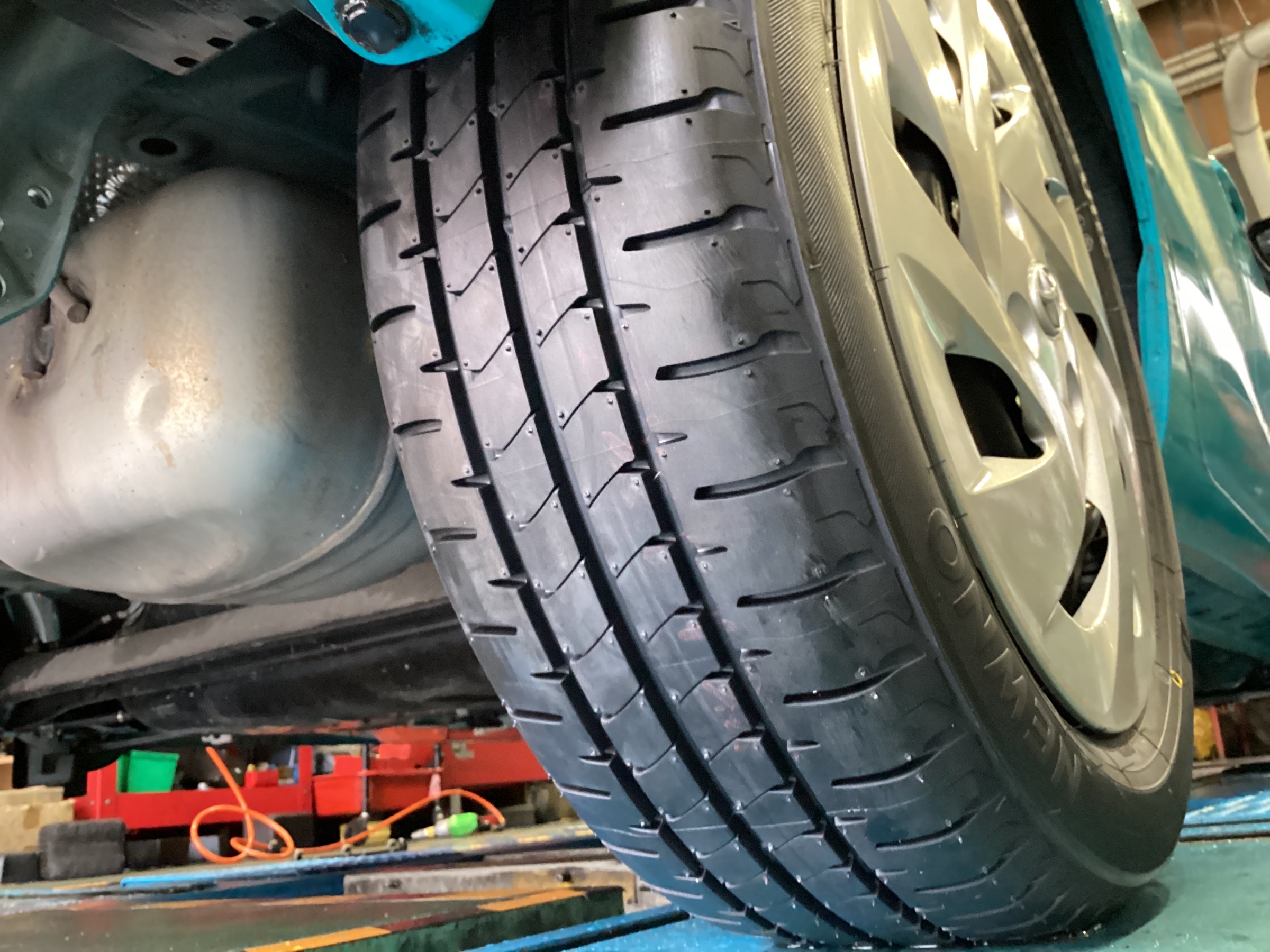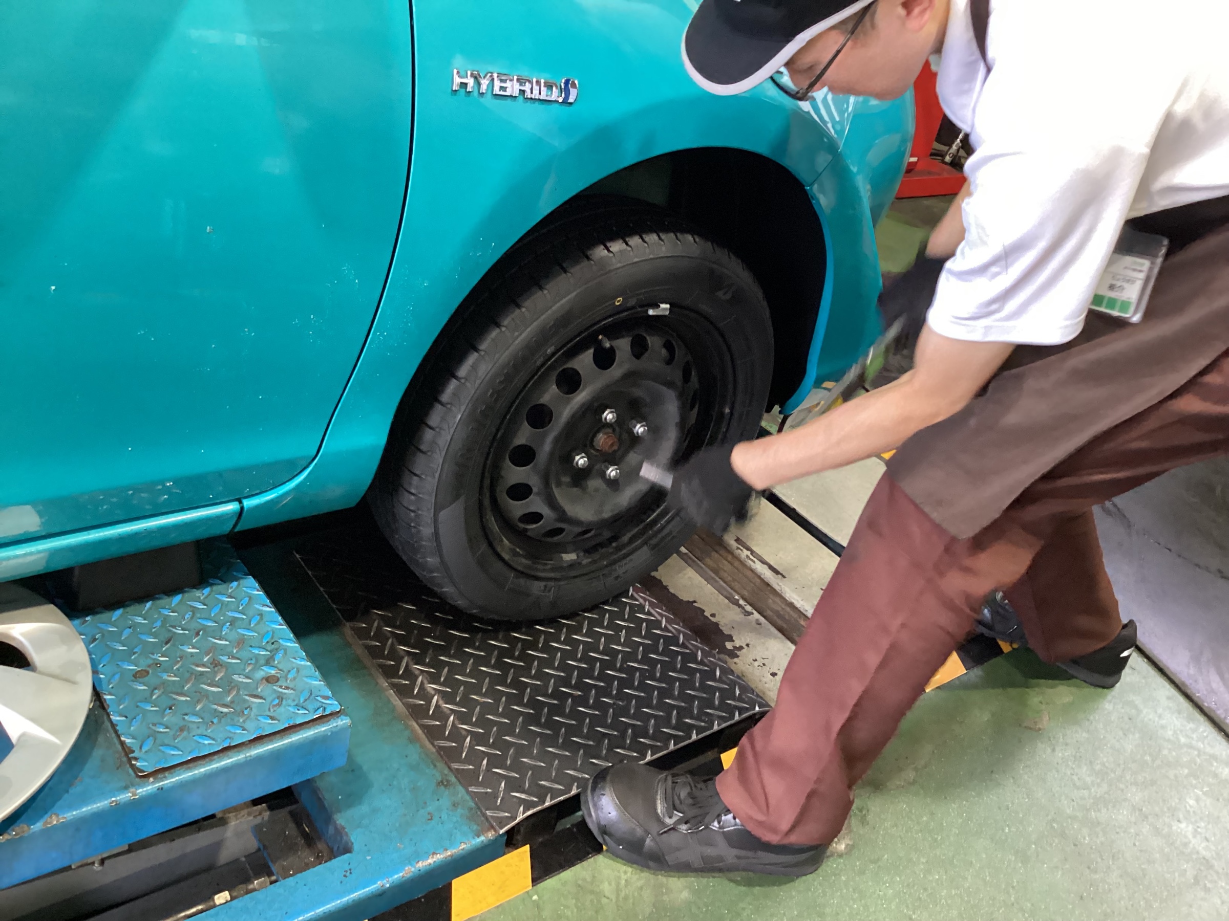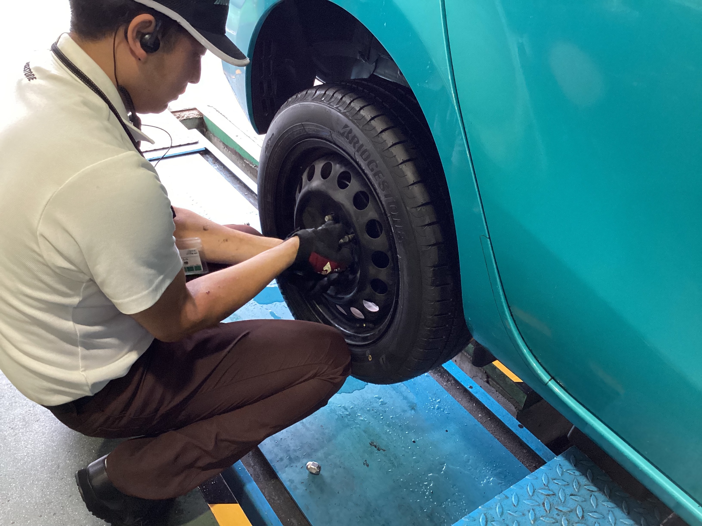アクアのタイヤ交換作業です。擦り減ったタイヤを新品に交換しました。選ばれたタイヤは、ブリヂストン NEWNO(ニューノ)。