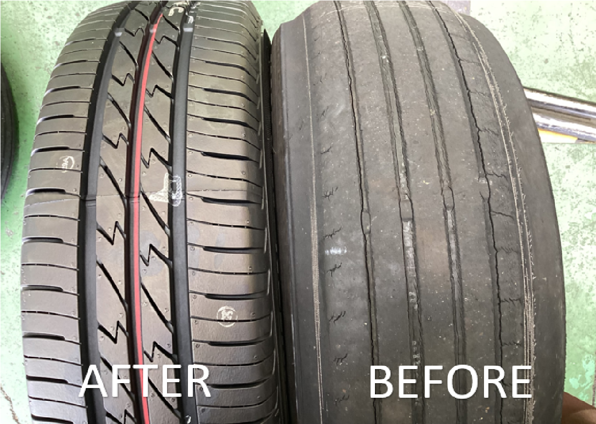 こう見てもらうとタイヤ交換前のタイヤの溝が少なくなっていることがわかりますね。