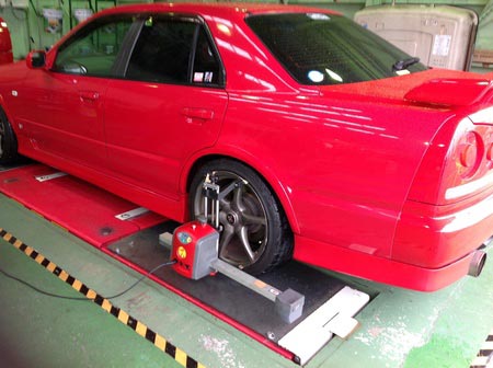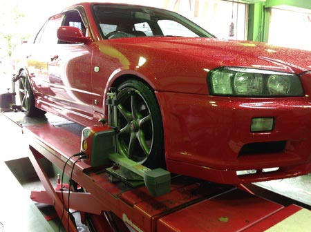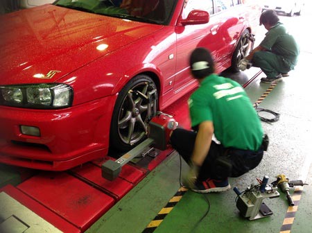 R34スカイラインセダン 車高調整&アライメント調整!!