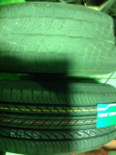 こちらのお車は純正タイヤがデューラーH/Tがついていて同じ方向性で