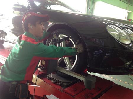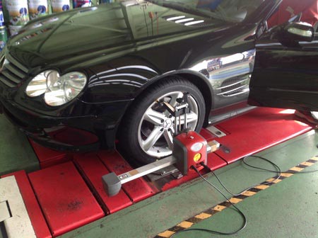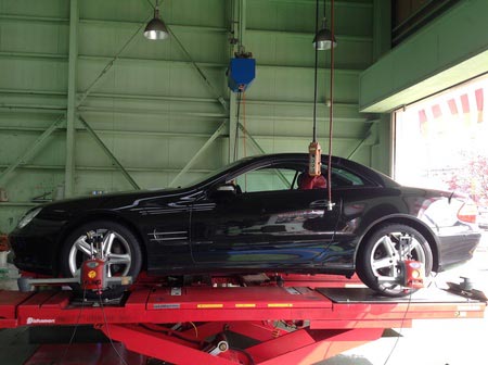 SL500は頻繁に入庫する車ではないので、今回はアライメント職人でおなじみ廣澤と、ベテラン園田の2人でバッチリ調整させていただきました!!