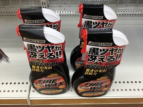 タイヤワックスです!タイヤのゴムには油分や薬品が含まれ劣化の抑制の働きがあります。これらをサポートすべくタイヤの側面にこのタイヤワックスをサッとひと塗り。こまめに塗ることで何もしないよりタイヤにヒビがあらわれにくくなります。タイヤもツヤがでて綺麗に見えます。
