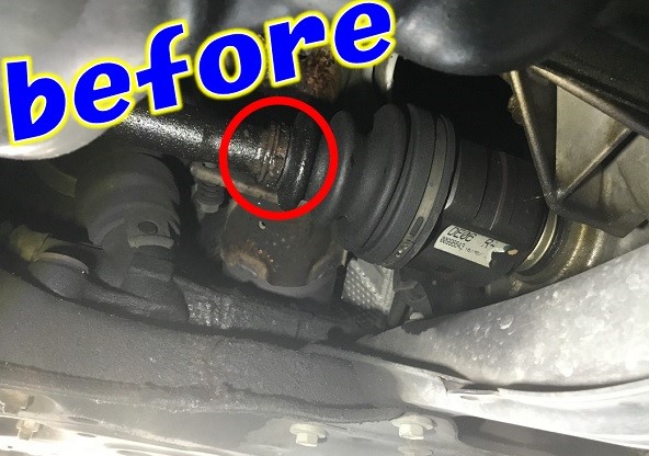 画像はドライブシャフトというエンジンの駆動力をタイヤに伝える部分です。ドライブシャフト連結部分にはグリスが塗られており異物や水の混入を防ぐためにブーツというゴムの部品で保護されています。しかしゴムが経年劣化するとグリスが漏れてきてしまうんです。ブーツの破損は部品の損傷につながり車検にも受かりません。