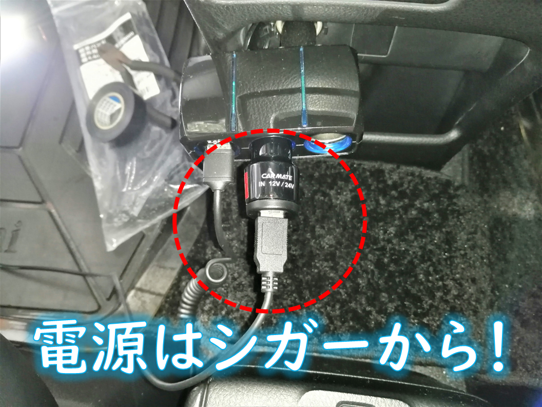 今回、電源はシガーソケットから取りました!