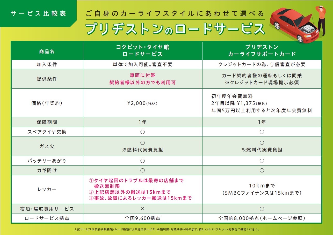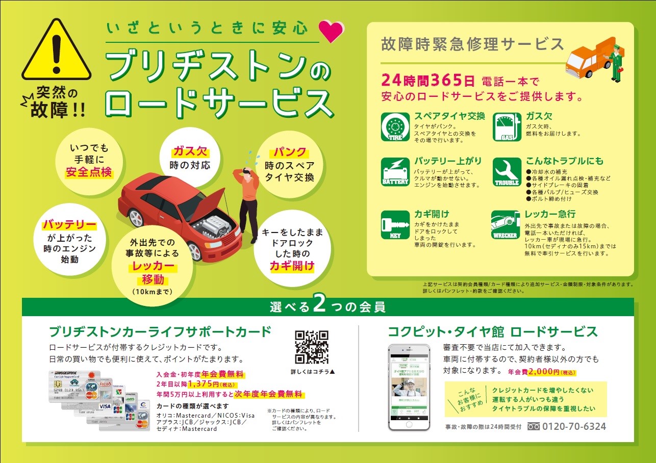 タイヤ館ロードサービス 加入受付中! ポスト ●お車のトラブルへの備えも、当店にお任せください! 例えば次のようなトラブルを助けてくれます! ① スペアタイヤ交換 ② ガス欠 ③ バッテリー上がり ④ カギ開け ⑤ レッカー移動 ロードサービスに何も加入していない方必見! お車のトラブルは独りでは解決できないことが 多いです。 困る前に備えて安心! 詳しくは店頭スタッフまで お尋ねください! カテゴリ:商品情報 その他商品・サービス