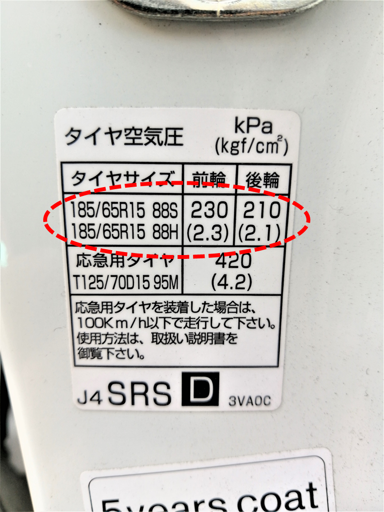 前輪:230kPa/後輪:210kPa