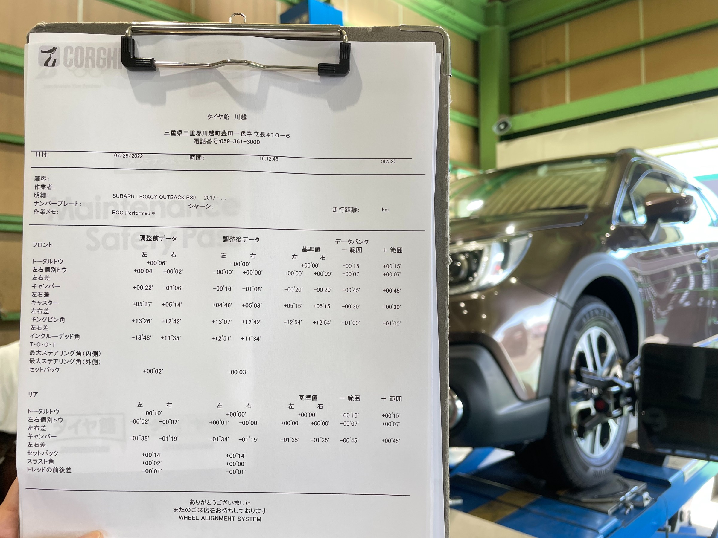 ★【スバル・DBA-BS9・レガシィアウトバック】夏タイヤ交換・アライメント測定·調整