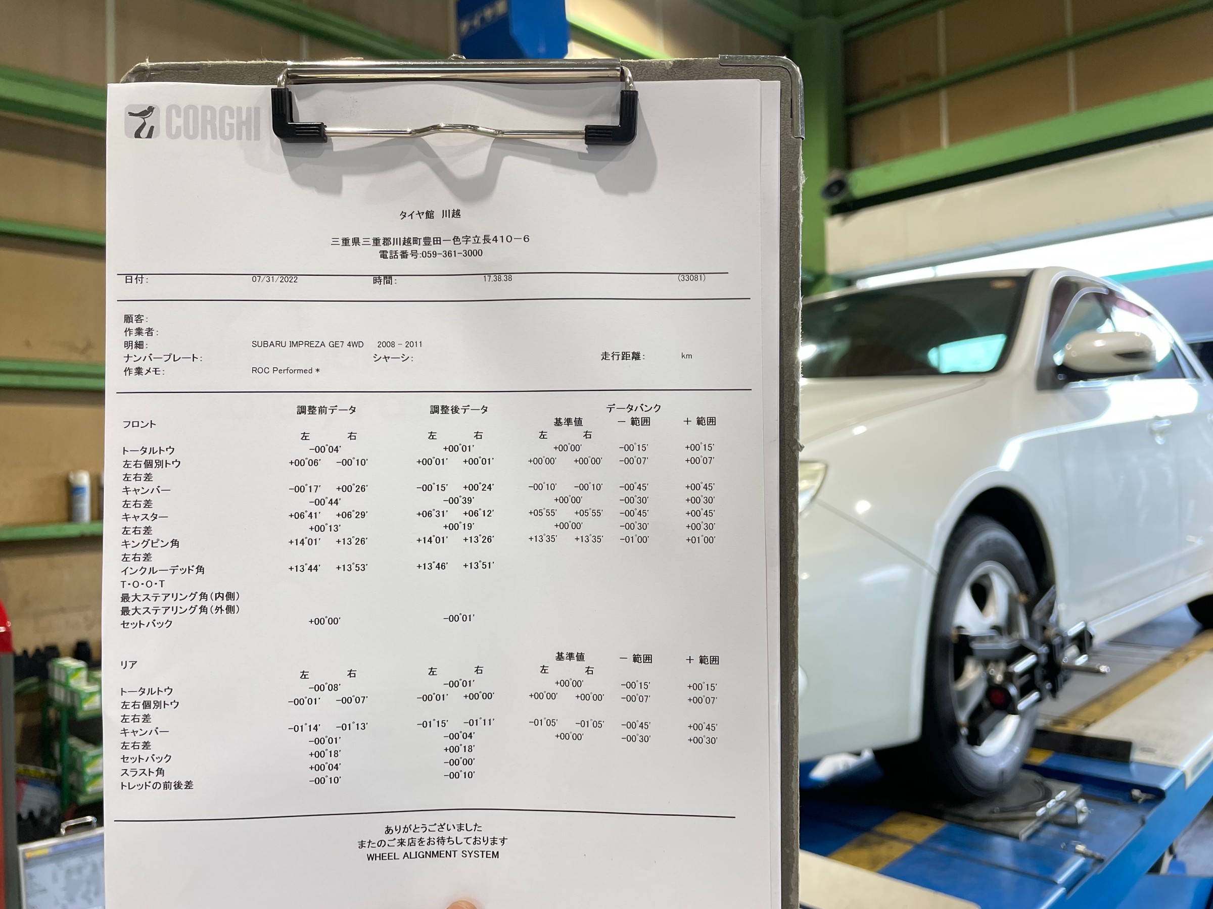 ★【スバル・DBA-GE7・インプレッサ】アライメント測定・調整