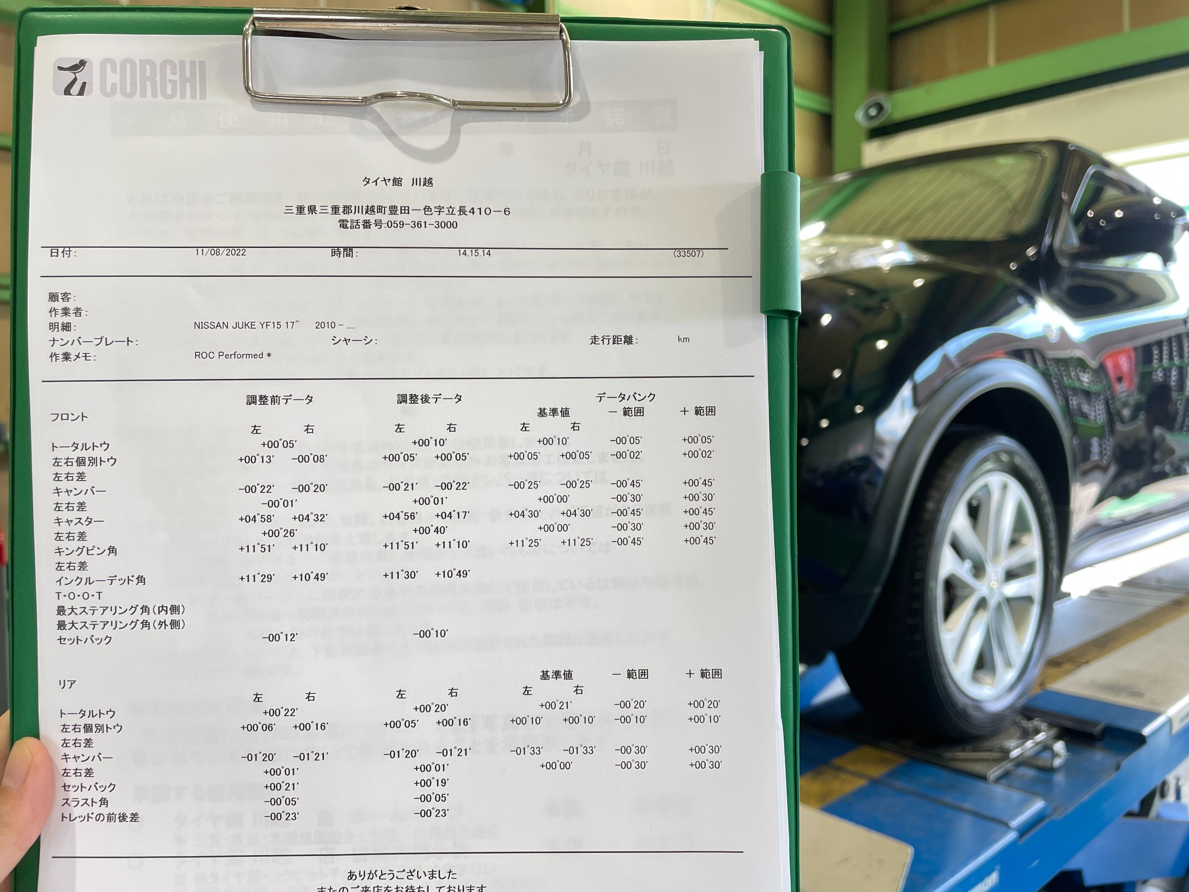 ★【ニッサン・DBA-YF15・ジューク】夏タイヤ交換・アライメント測定・調整