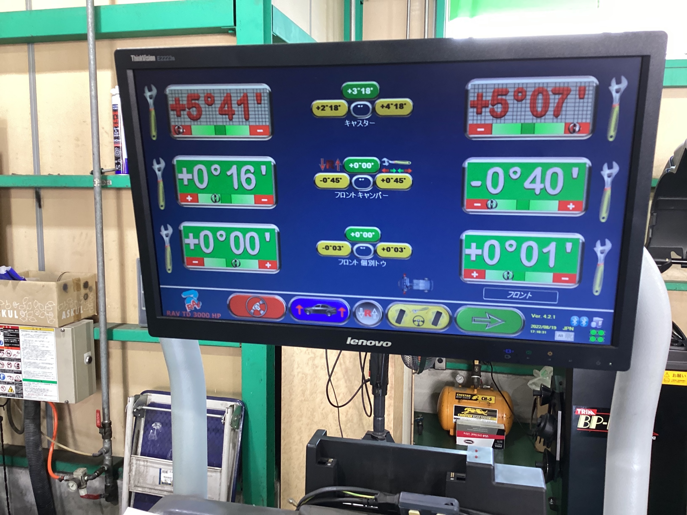 出したデーターを基にタイヤの角度を調整していきます。