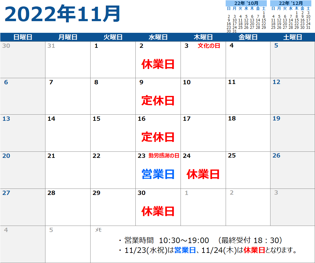 【2022年11月】営業日のご案内 ポスト 2022年11月1日 11/23(水)は祝日の為、営業日 翌24(木)は振替休業日となります。 ご不便をお掛けするかと思いますが 何卒宜しくお願い致します。 尚、24日(木)は タイヤ館生桑(7.6km先) … 059-330-3271 タイヤ館日永(10km先) … 059-349-1255 タイヤ館スズカ(18km先) … 059-369-1123 タイヤ館津(41km先) … 059-238-0500 は営業しておりますので お急ぎの際は上記店舗をご利用下さい。 カテゴリ:お知らせ