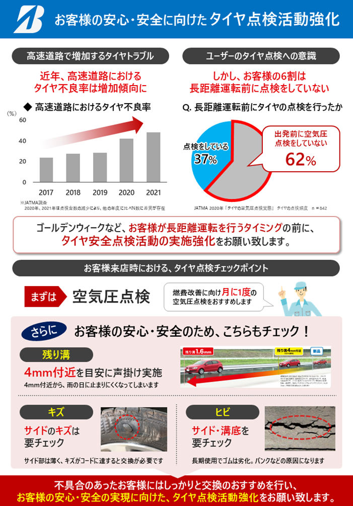 タイヤの空気圧不足で走行している車が4台に1台となっています。。。