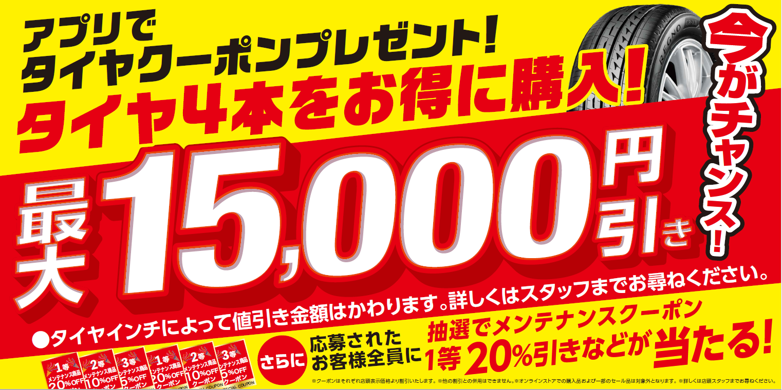 タイヤに日にちなんでアプリ登録でタイヤインチによって最大15000円引きのクーポンプレゼント!!