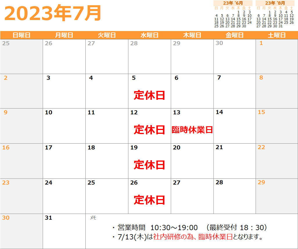 【2023年7月】営業日のご案内 ポスト 2023年7月1日 7/13(木)は社内研修の為、臨時休業となります。 ご不便をお掛け致しますが 何卒ご理解頂きます様、宜しくお願い致します。 カテゴリ:お知らせ