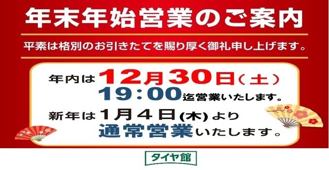 年末年始営業のお知らせ ポスト 2023年12月30日 いつもタイヤ館川越をご利用いただきありがとうございます。 タイヤ館川越店 年末年始営業時間と定休日のご案内 よろしくお願いいたします。 カテゴリ:お知らせ