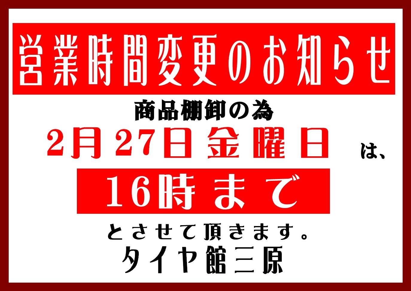 本日の営業時間は16時までです。 ポスト 2026年2月27日 タイヤ館 三原 住所:723-0051広島県三原市宮浦6丁目16番1号 電話番号: 0848-64-5656 タイヤ点検・安全点検/タイヤ履き替え/オイル交換/その他ピット作業の予約 カテゴリ:お知らせ 担当:山本