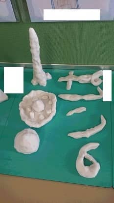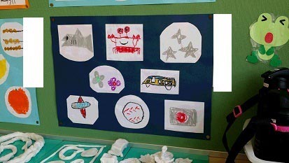 教室には小学校で作った粘土や絵があり