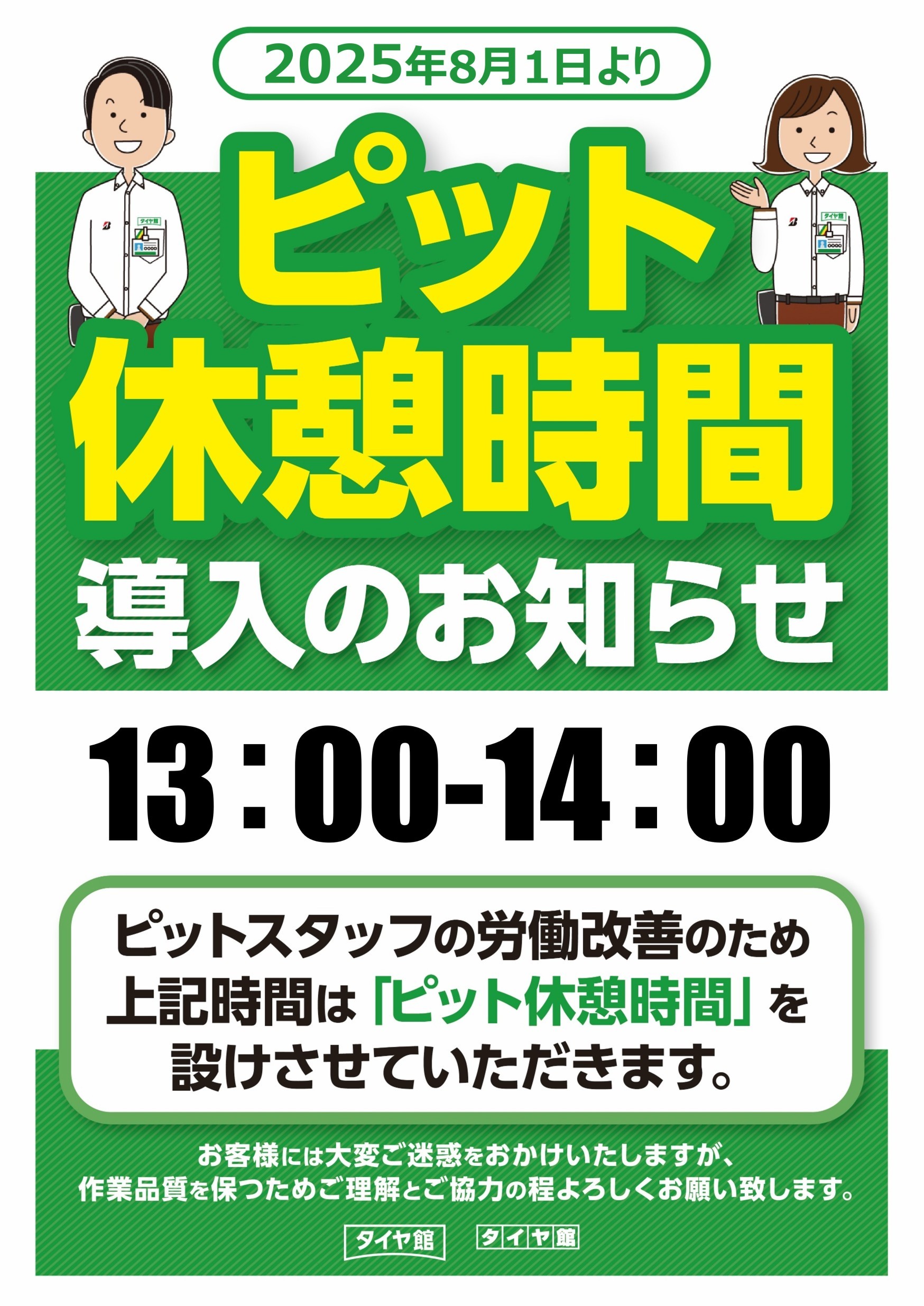 【2025年8月1日(金)より ピット休憩時間導入のお知らせ】