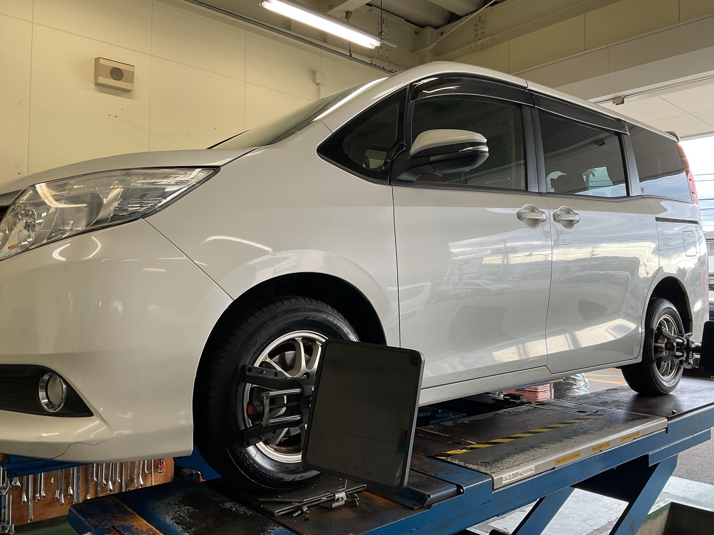 タイヤの取り付けに合わせて、アライメント測定・調整作業を行いました。