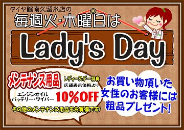 タイヤ館南久留米店では、毎週火・木曜日は女性のお客様にお得な「レディースデー」を実施しております!