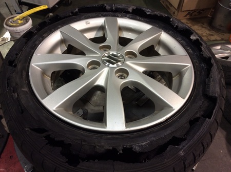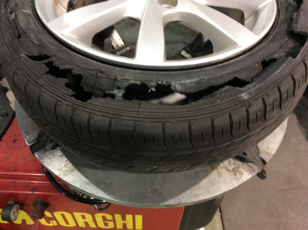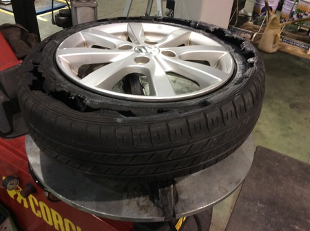 本日はタイヤの空気圧が殆んど無い状態で走ってしまうとどうなってしまうのか?写真を載せましたのでご覧下さい。どうですか?なかなかの衝撃映像ですよね?高速道路を