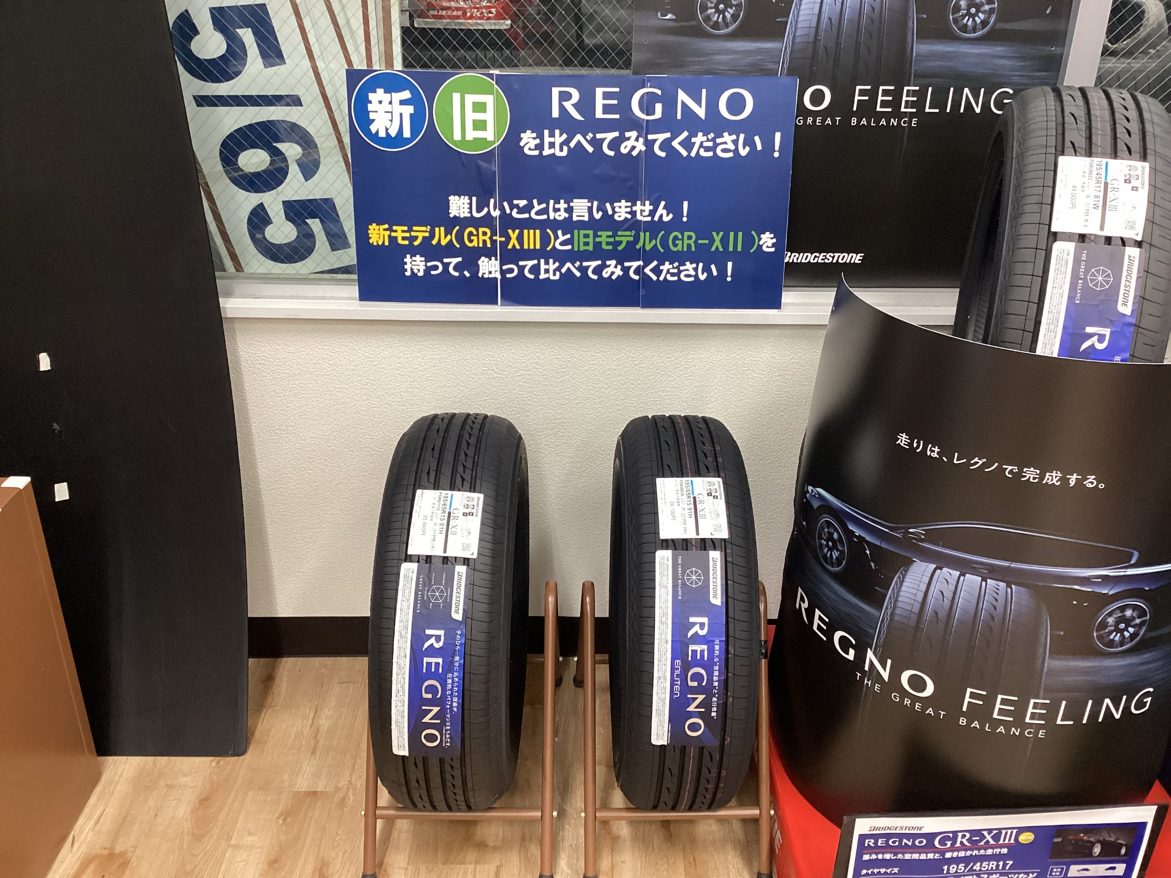 タイヤ館三島店では入口から入ってすぐのスペースにREGNO GR-XⅢのコーナーを展開しております。
