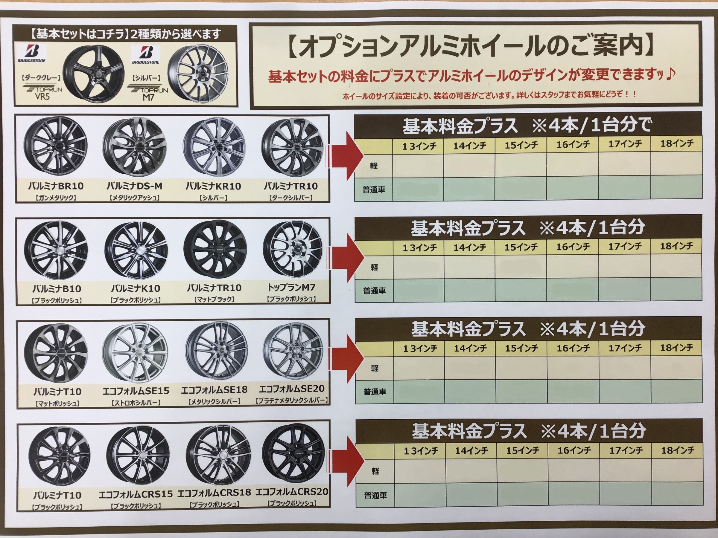 【ブリヂストンアルミホイール】 ポスト 2020年11月2日 スタッドレスに組み合わせるアルミホイールも 当店なら多数オプションをご用意しております♪ 基本料金にプラスでお好みのデザインへ変更可能です(^^)/ もちろん、 夏用タイヤに⇒新品アルミ 冬用タイヤに⇒純正ホイール など、夏/冬の入替えもお任せ下さい!(^^♪ 冬用タイヤ、スタッドレスも当店にお任せ下さい! ご来店お待ちしております<m(__)m>